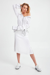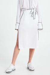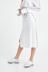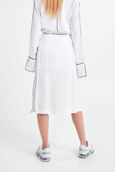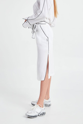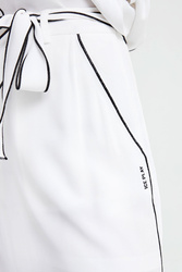 Spódnica w białym kolorze marki ICE PLAY. Wykończona kontrastową nitką. W talii wiązany pasek. Po lewej stronie mały nadruk z logo marki. Po bokach głębokie rozcięcia. Zapinana z boku na kryty zamek. Idealna do letnich, sportowych stylizacji.