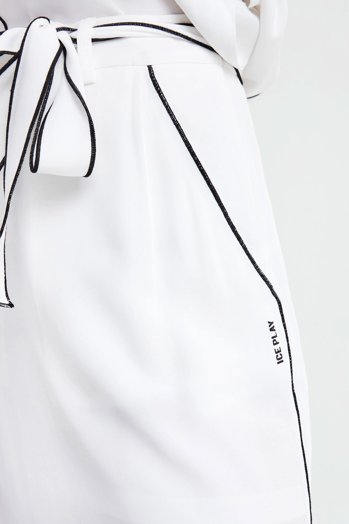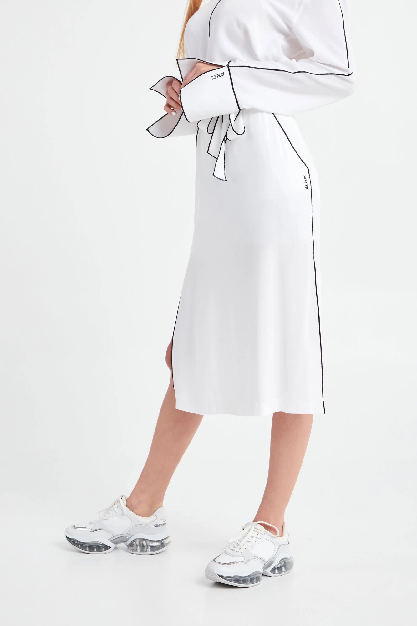 Spódnica w białym kolorze marki ICE PLAY. Wykończona kontrastową nitką. W talii wiązany pasek. Po lewej stronie mały nadruk z logo marki. Po bokach głębokie rozcięcia. Zapinana z boku na kryty zamek. Idealna do letnich, sportowych stylizacji.