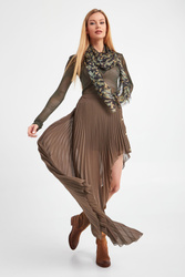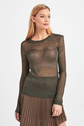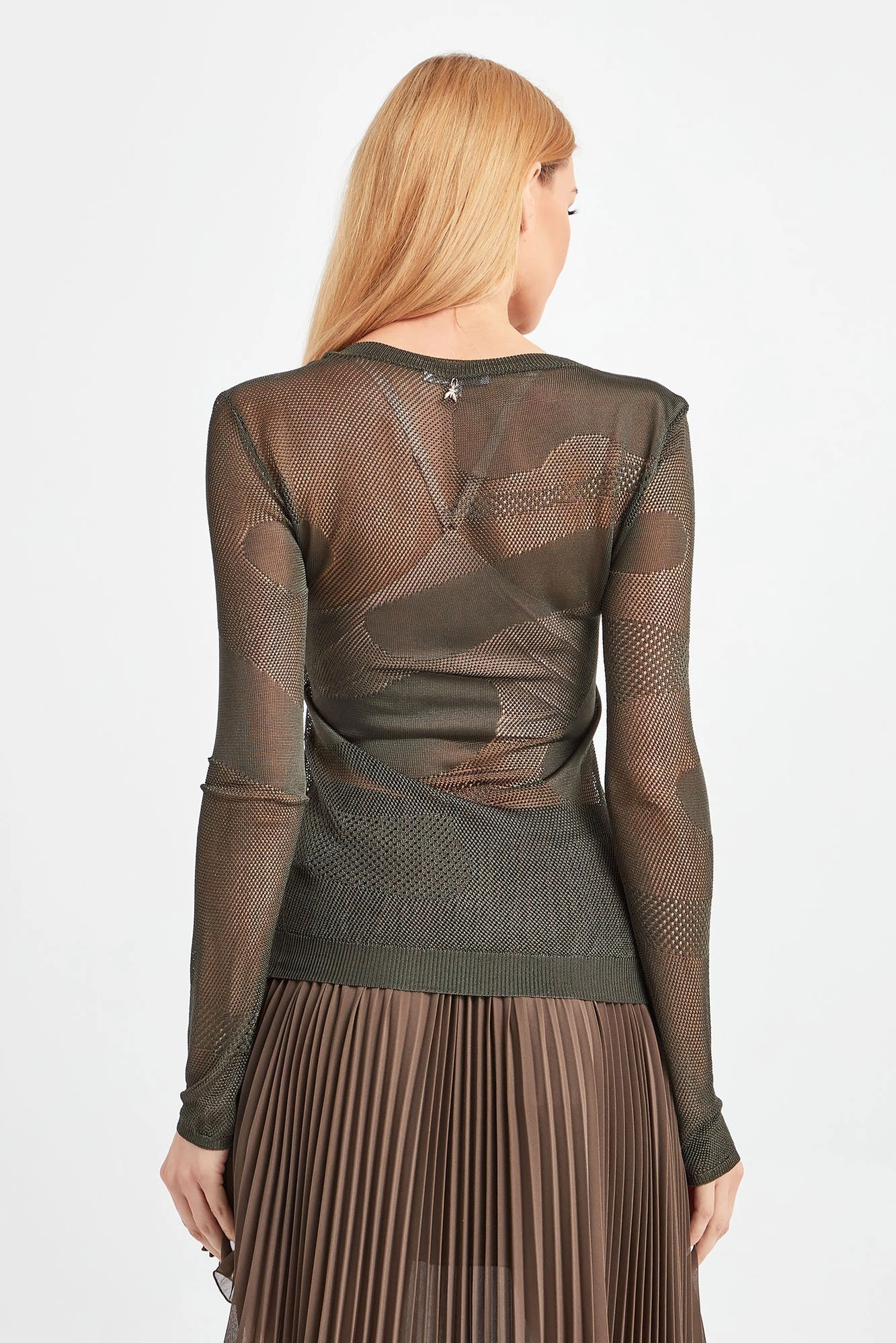 Sweter w kolorze khaki, o ciekawej, różnorodnej fakturze siatki. Dekolt o-neck. Dopasowany fason. Z tyłu dekoltu metalowa zawieszka z logo marki. Sweter wykonany z najwyższej jakości materiału, bardzo przyjemny w dotyku.