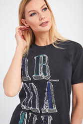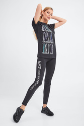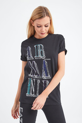 T-shirt EMPORIO ARMANI o luźnym fasonie w czarnym kolorze. Dekolt o-neck, wykończony ściągaczem. Z przodu wielokolorowy nadruk z nazwą marki przeszywany kolorową nicią. Rękaw zakończony wywinięciem. T-shirt wykonany z najwyższej jakości bawełny.