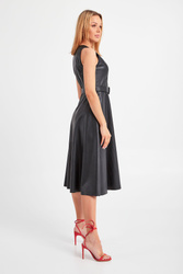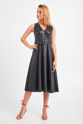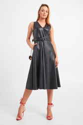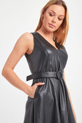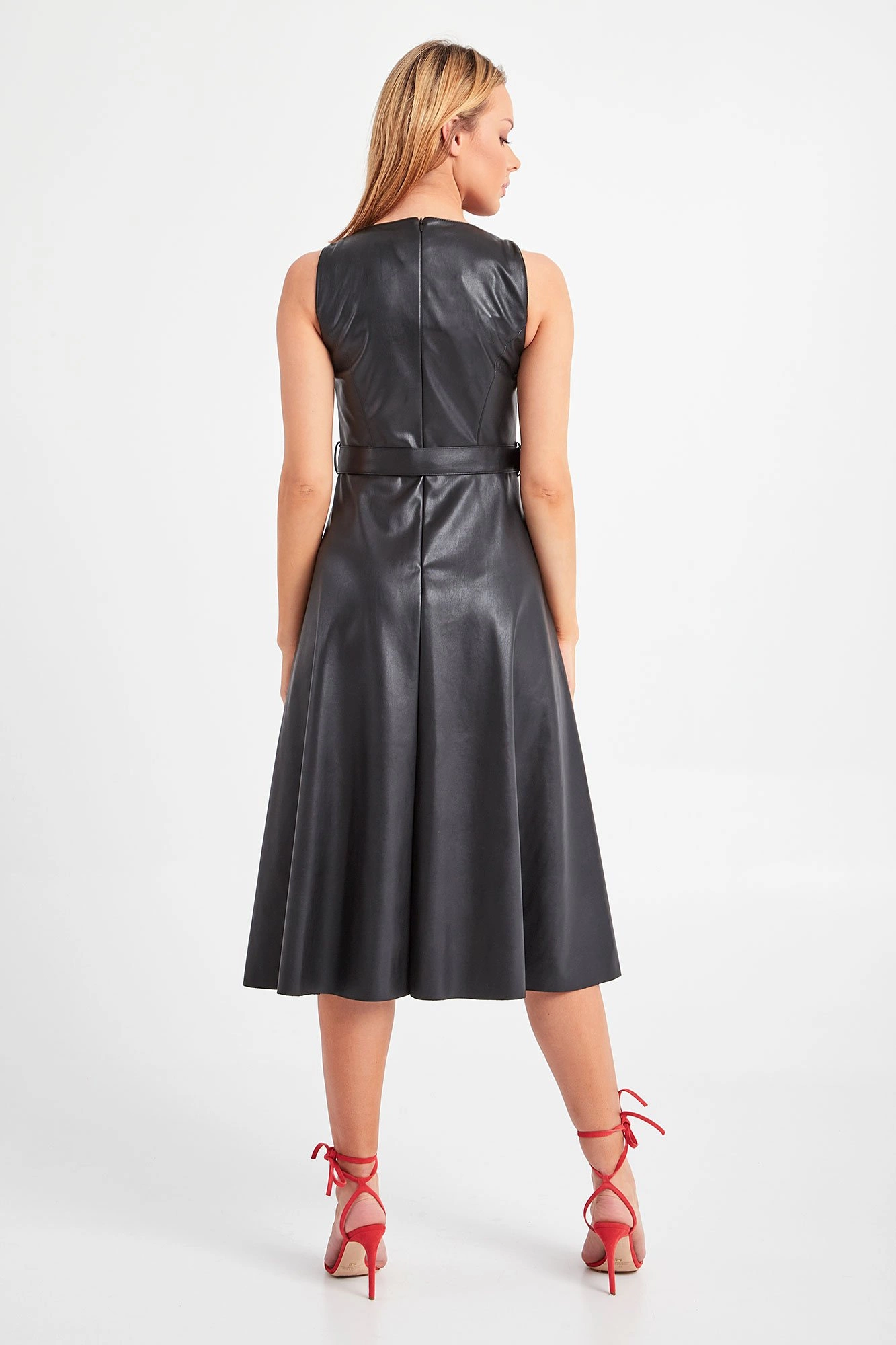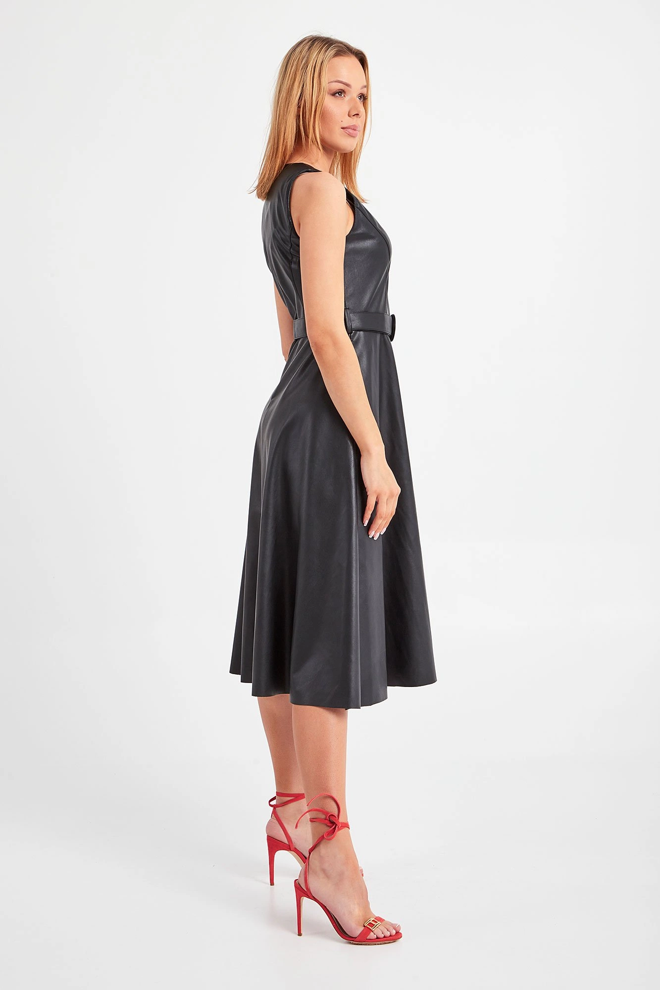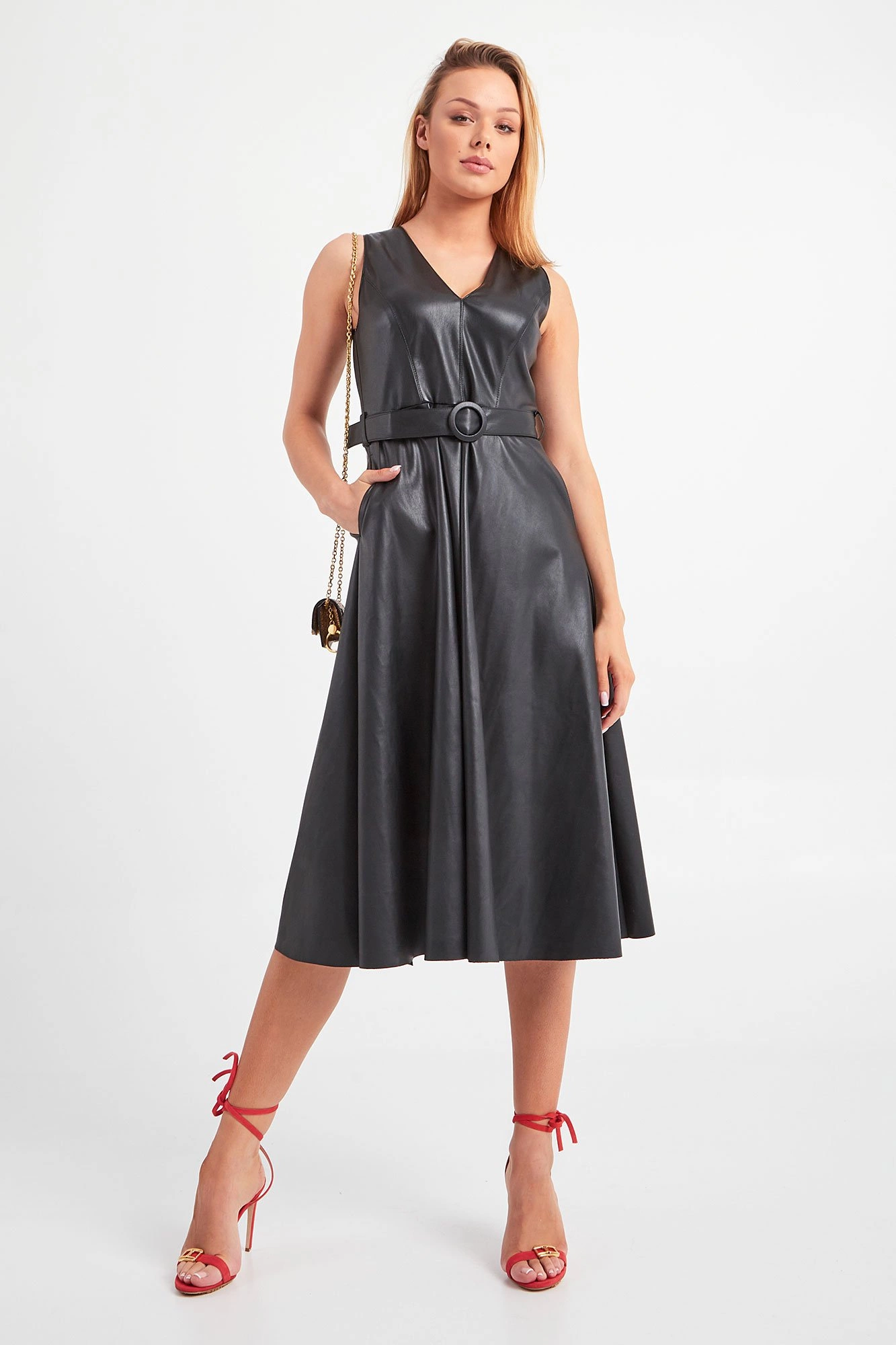 Sukienka bez rękawów w czarnym kolorze marki Marella. Fason regular fit. Dekolt v-neck. Długość midi. Zapinana na kryty zamek. Z przodu dwie kieszenie. Dół rozszerzający się ku dołowi. W komplecie pasek, podkreślający talię. Góra z gładką podszewką w czarnym kolorze. Sukienka wykonana z wysokiej jakości skóry ekologicznej. Elegancja w najmodniejszym wydaniu.