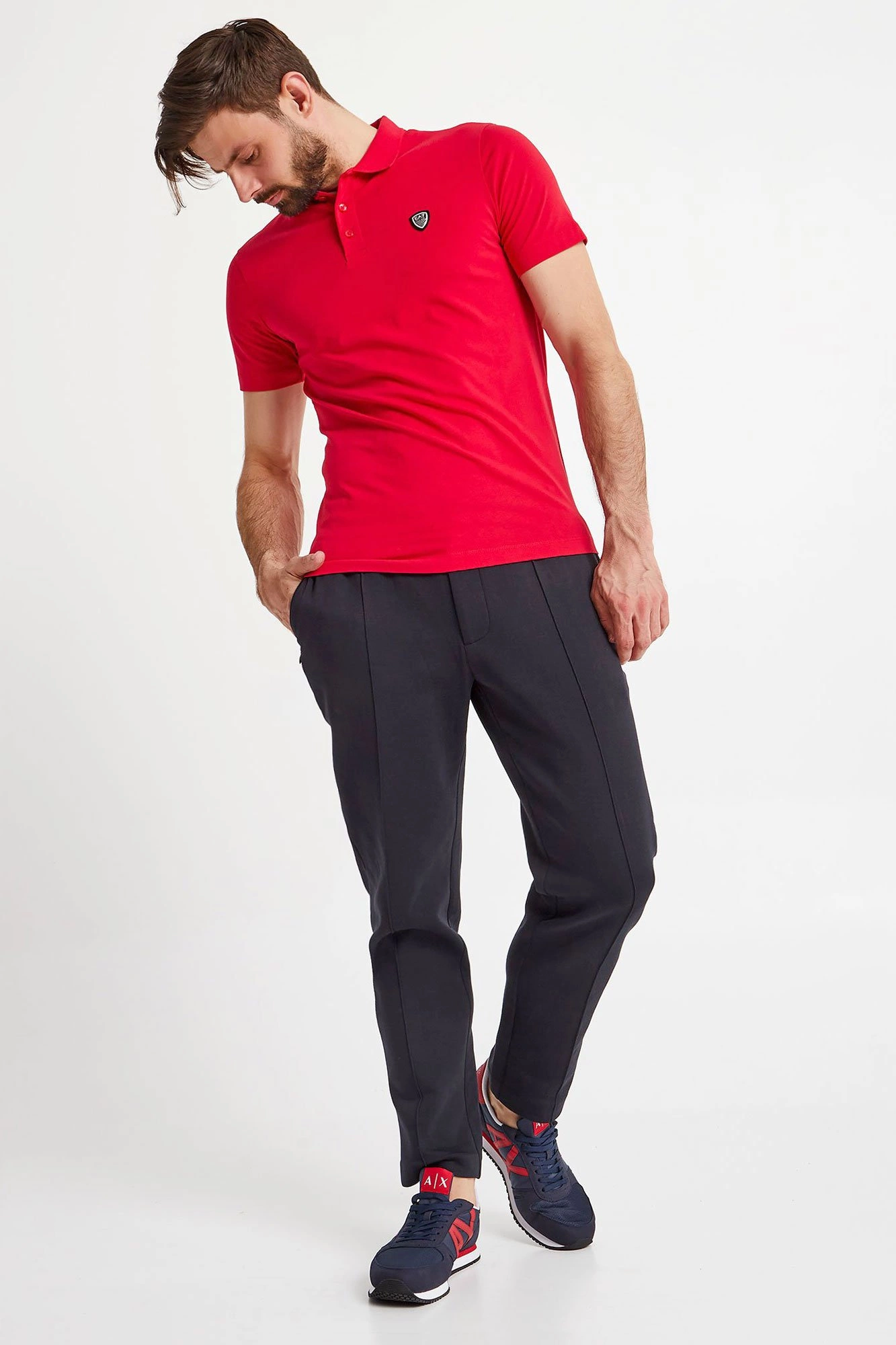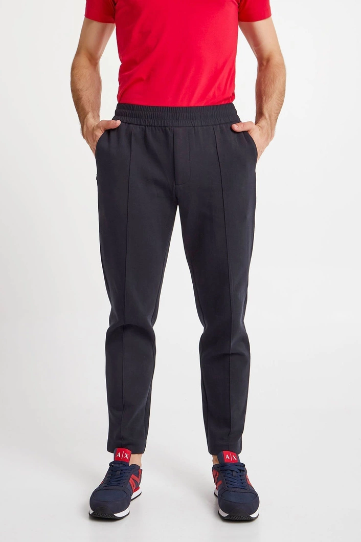 Spodnie marki Emporio Armani w grafitowym kolorze. Pas elastyczny. Model z czterema kieszeniami. Na prawej tylnej aplikacja z logo marki. Nogawki delikatnie zwężające się ku dołowi, z trwałym kantem. Spodnie wykonane z wysokiej jakości materiału z dodatkiem elastanu.