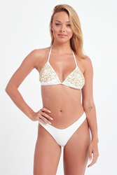 Góra od bikini marki Twinset w kolorze ecru. Miseczki trójkątne, z usztywnieniem. Zdobione złotą nitką metaliczną i cekinami. Wiązanie na szyi i plecach. Góra od bikini wykonana z wysokiej jakości materiału. Wyjątkowo kobiece bikini.