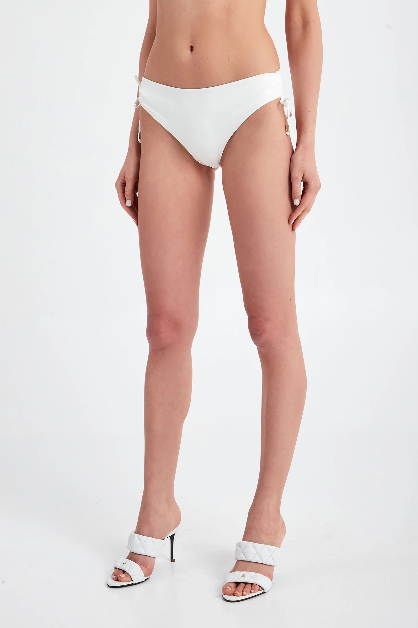 Dół od bikini marki U&B Mare Twinset w kolorze ecru. Kobiecy krój slip global. Charakteryzuje się marszczeniami po bokach. Regulowanymi za pomocą troczków. Z tyłu złota aplikacja w kształcie serca z tłoczeniem nazwy marki. Podszewka w kolorze ecru, gładka. Dół od bikini wykonany z wysokiej jakości, szybkoschnącego materiału. Sprawdzi się idealnie podczas letnich wypadów.