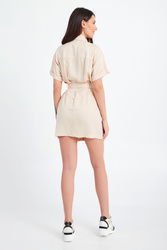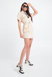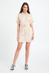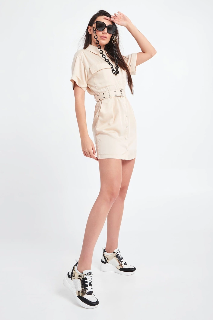 Sukienka z krótkim rękawem marki Patrizia Pepe w jasnobeżowym kolorze. Fason regular fit. Zapinana na ozdobne napy. Kołnierzyk prosty. Z przodu cztery niezapinane kieszenie - dwie z patką. Rękawy wykończone podwinięciem. W komplecie pasek zapinany na ozdobną klamrę, pięknie podkreślający talię. Sukienka wykonana z wysokiej jakości materiału z włókien drzewnych. Przyjemna w dotyku, lekka.