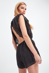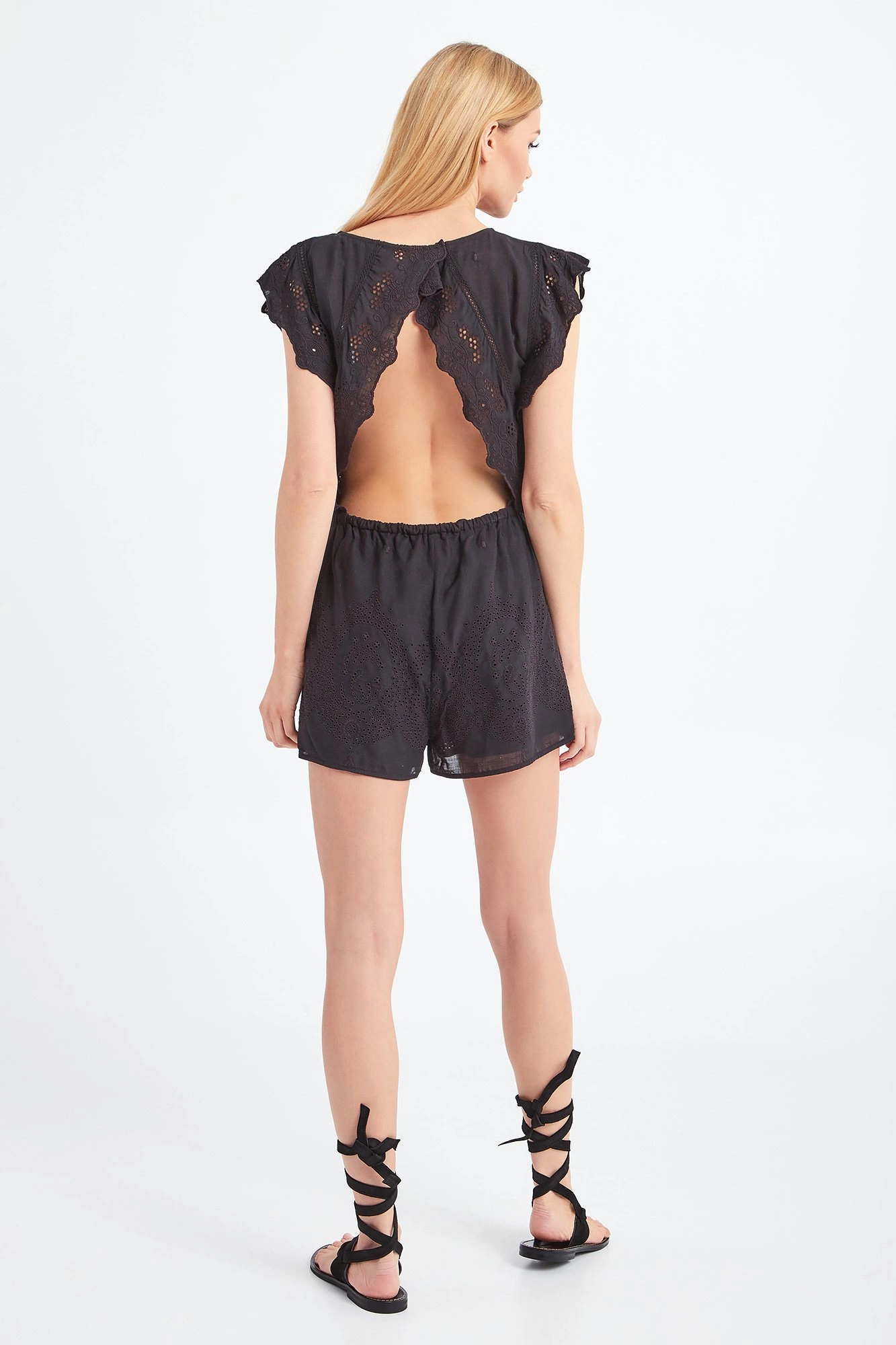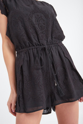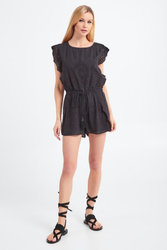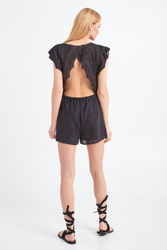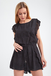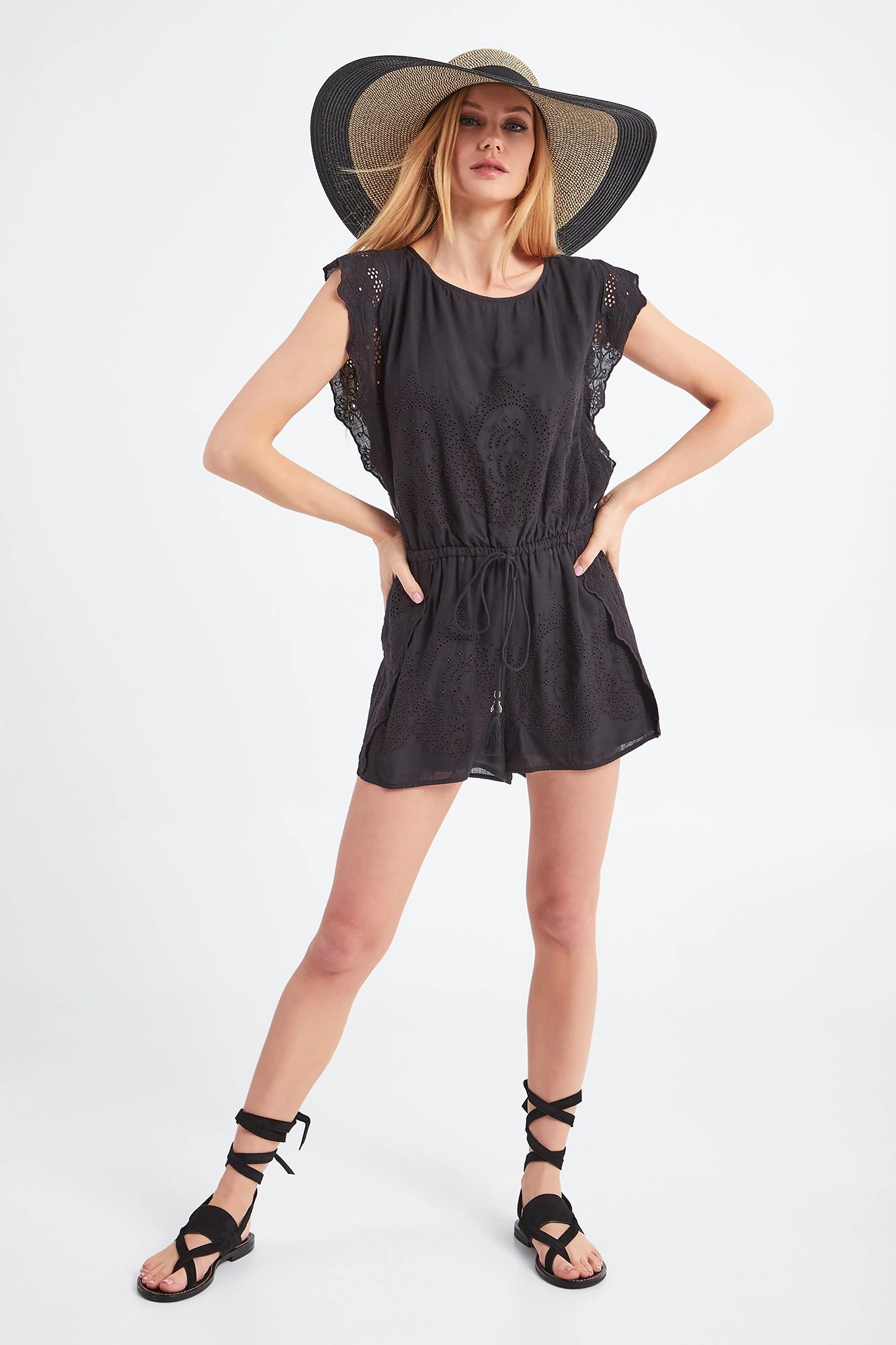 Kombinezon marki Patrizia Pepe w czarnym kolorze. Na całości zdobienia w postaci haftu i ażuru. Fason regular fit. Zapinany z tyłu na napy. Dekolt typu o-neck. Pas elastyczny regulowany za pomocą troczków wykończonych frędzlami i zdobionych srebrną aplikacją logo marki. Z tyłu duże rozcięcie. Kombinezon wykonany z wysokiej jakości wiskozy i bawełny. Kobiecy, idealny jako baza letnich stylizacji.