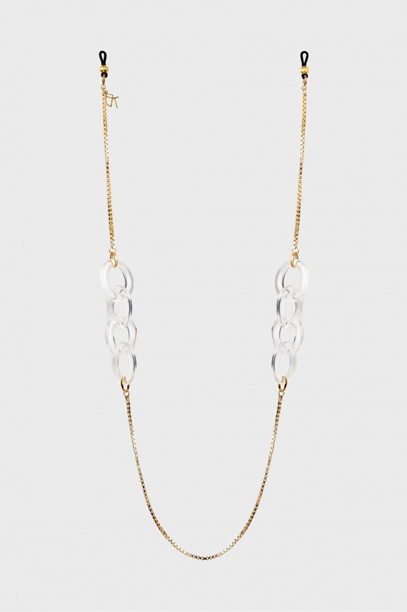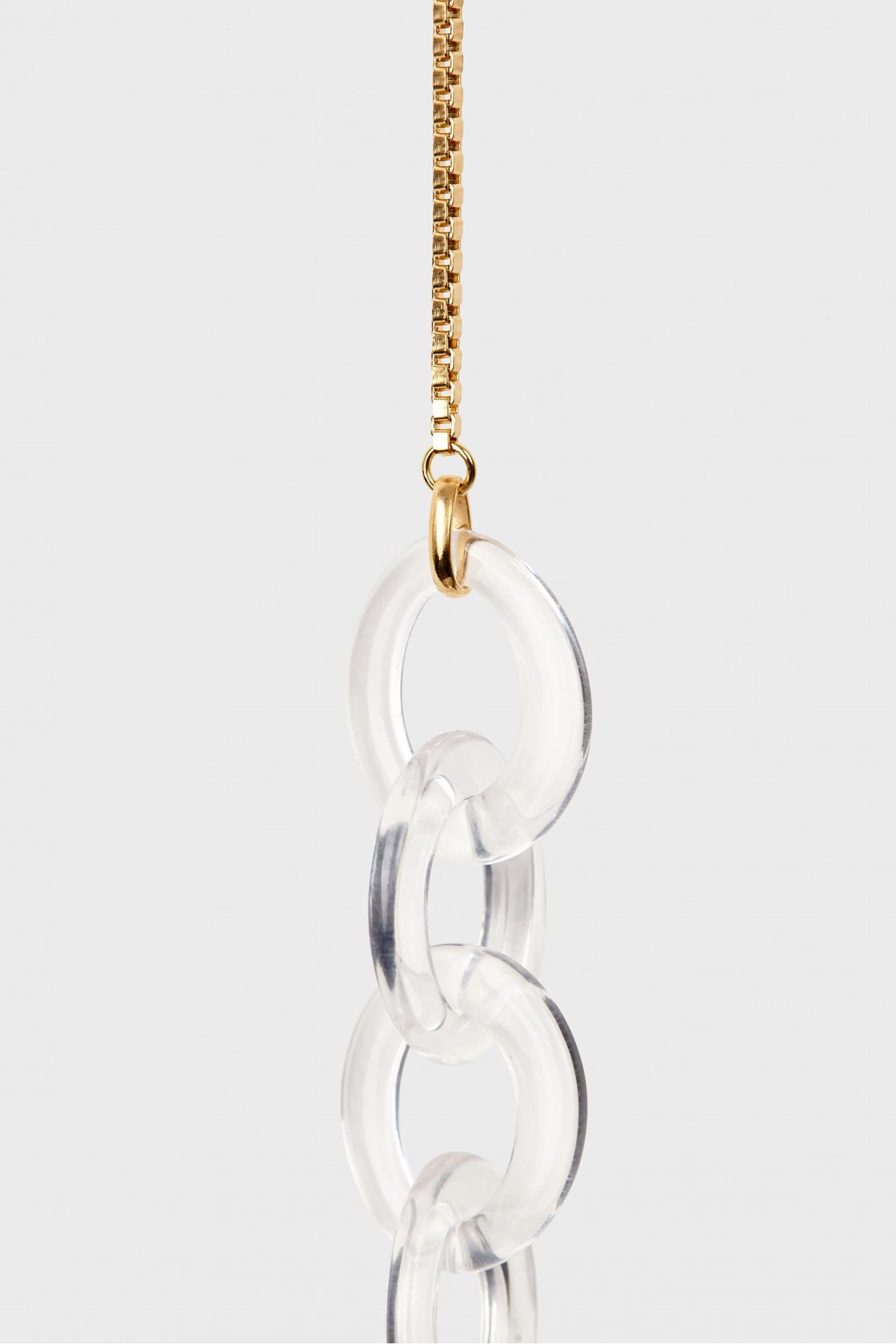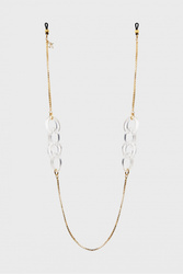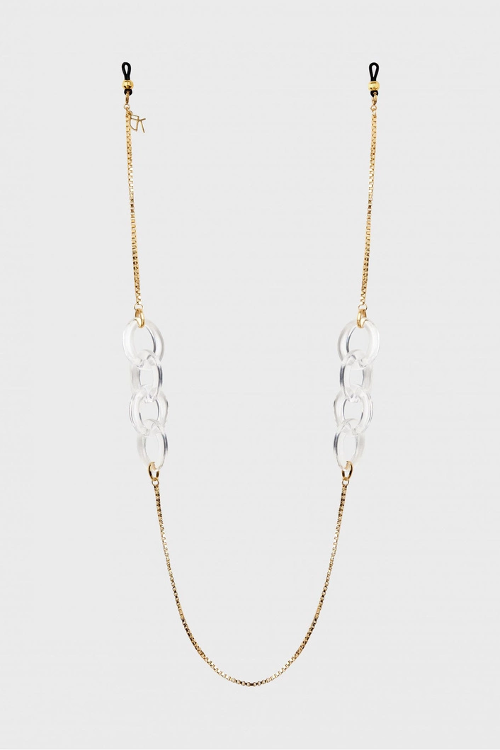 Biżuteryjny łańcuszek do okularów w złotym kolorze. Połączenie fasetowego łańcuszka i akrylowych grubszych, transparentnych pierścieni. Doskonały dodatek do okularów wzbogacający każdą stylizację.