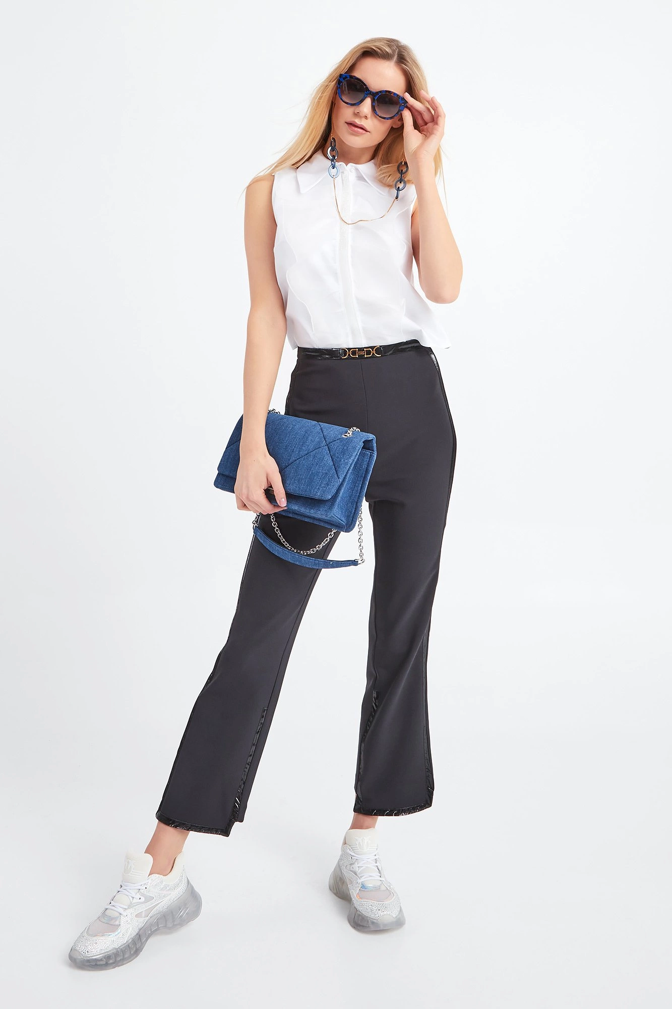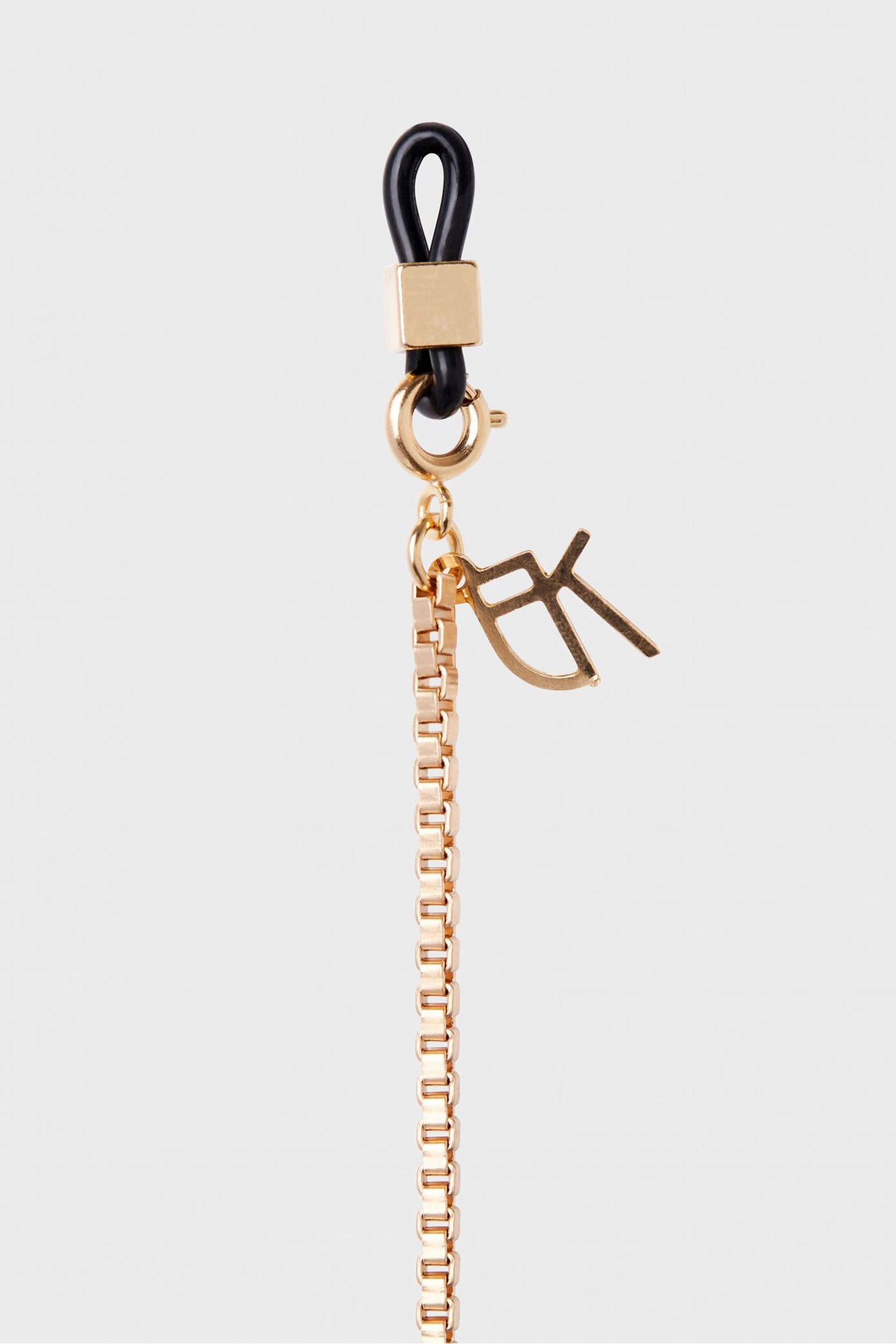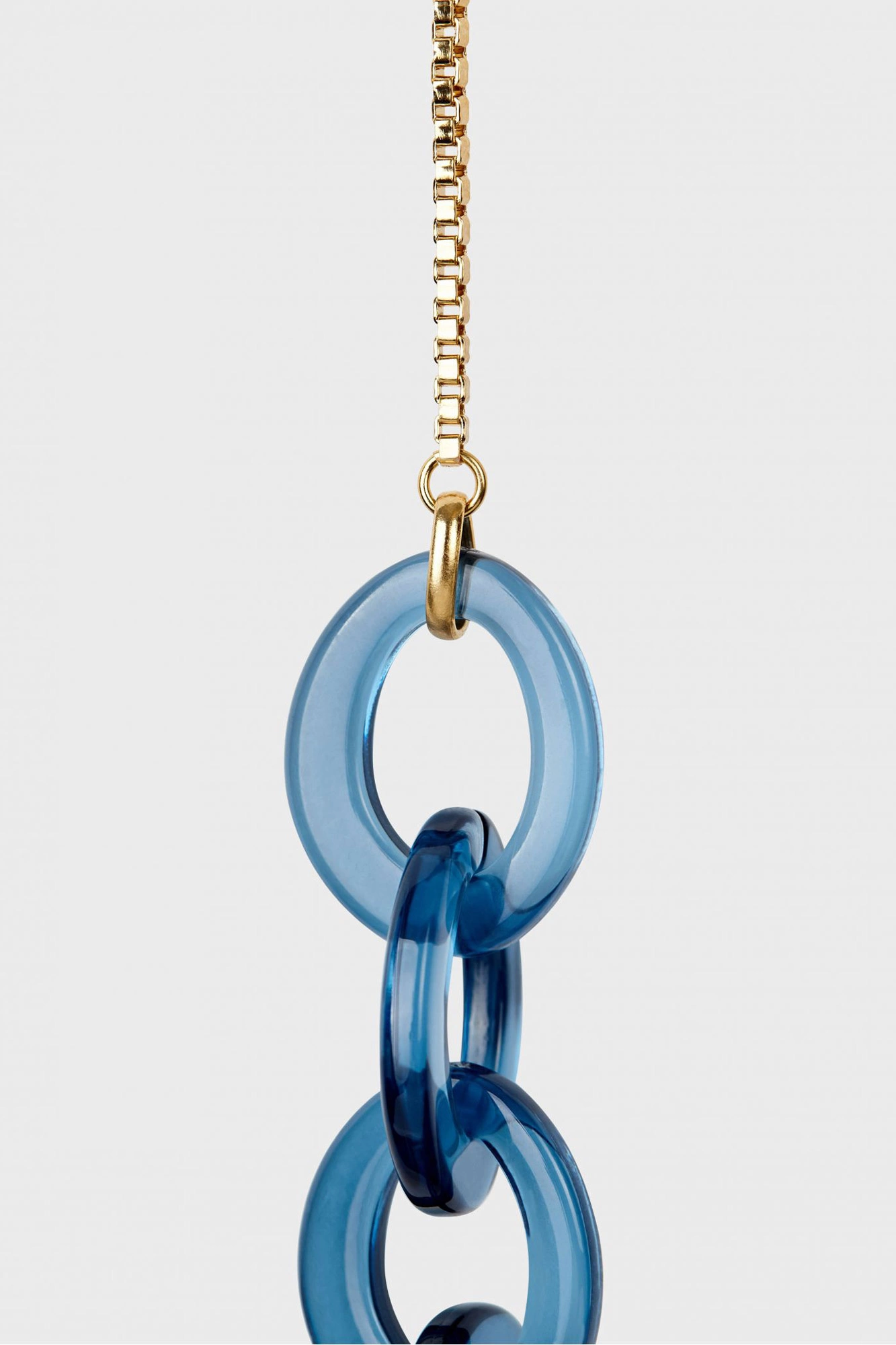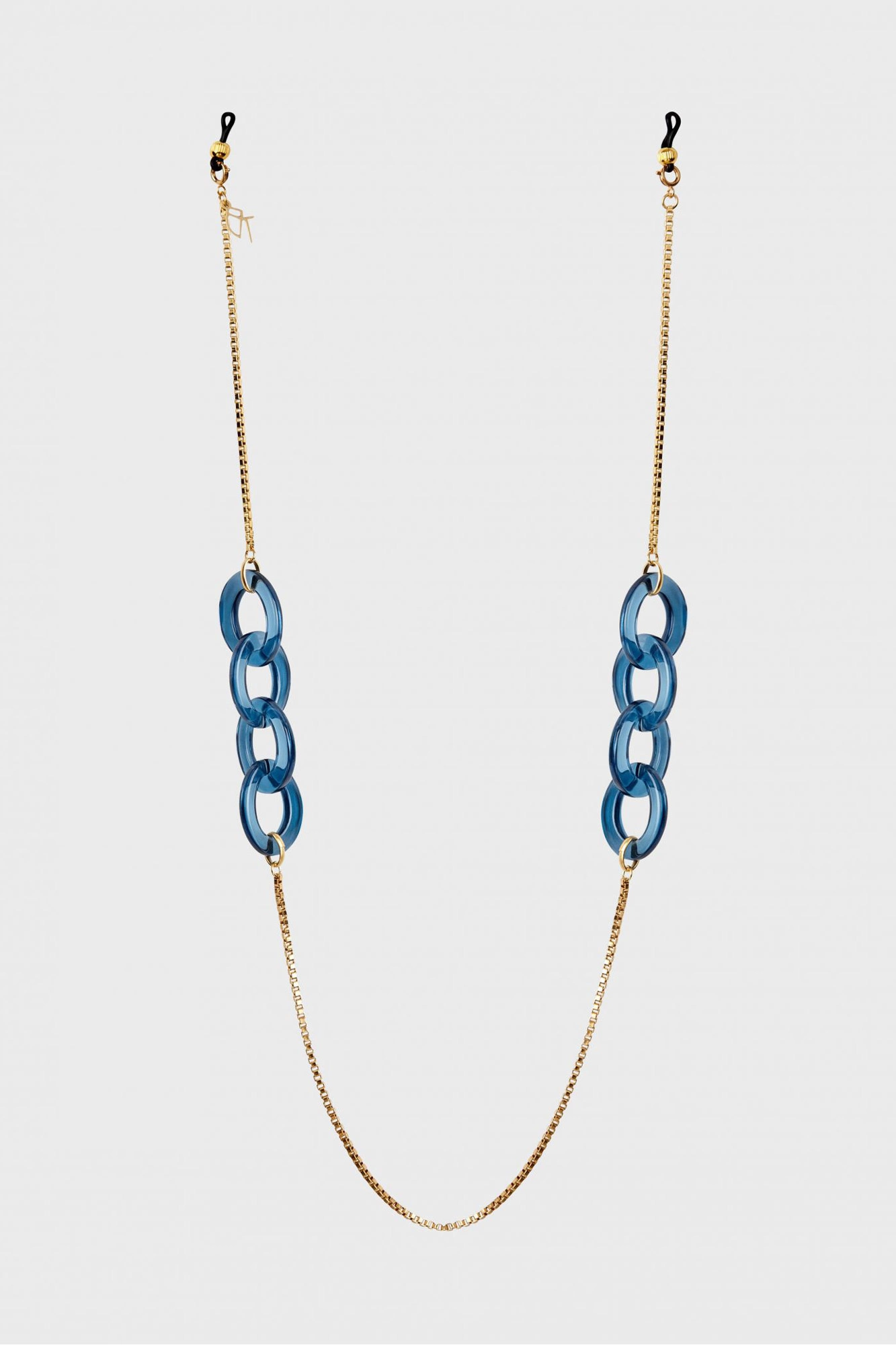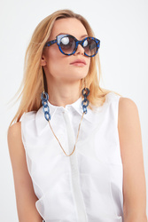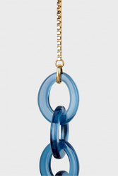 Biżuteryjny łańcuszek do okularów w granatowo-złotym kolorze. Połączenie fasetowego łańcuszka i akrylowych grubszych pierścieni. Doskonały dodatek do okularów wzbogacający każdą stylizację.