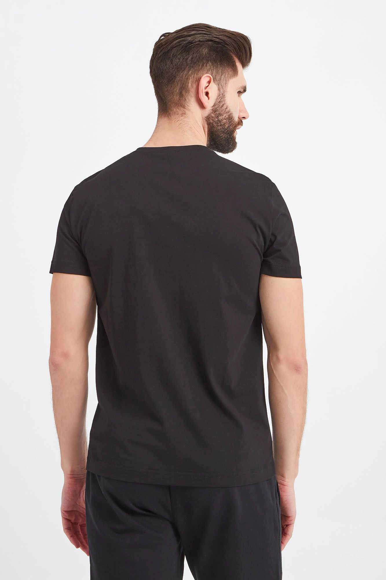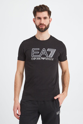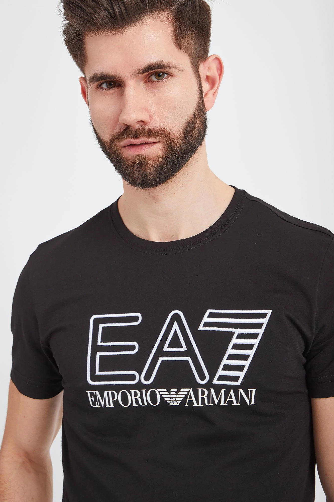 Czarny t-shirt marki EA7 Emporio Armani o prostym fasonie. Dekolt typu o-neck. Z przodu duży biały haft i nadruk nazwy oraz logo marki. Zdobienia tworzą oryginalny kontrast kolorystyczny. T-shirt wykonany z wysokiej jakości, miękkiej, bawełny.