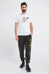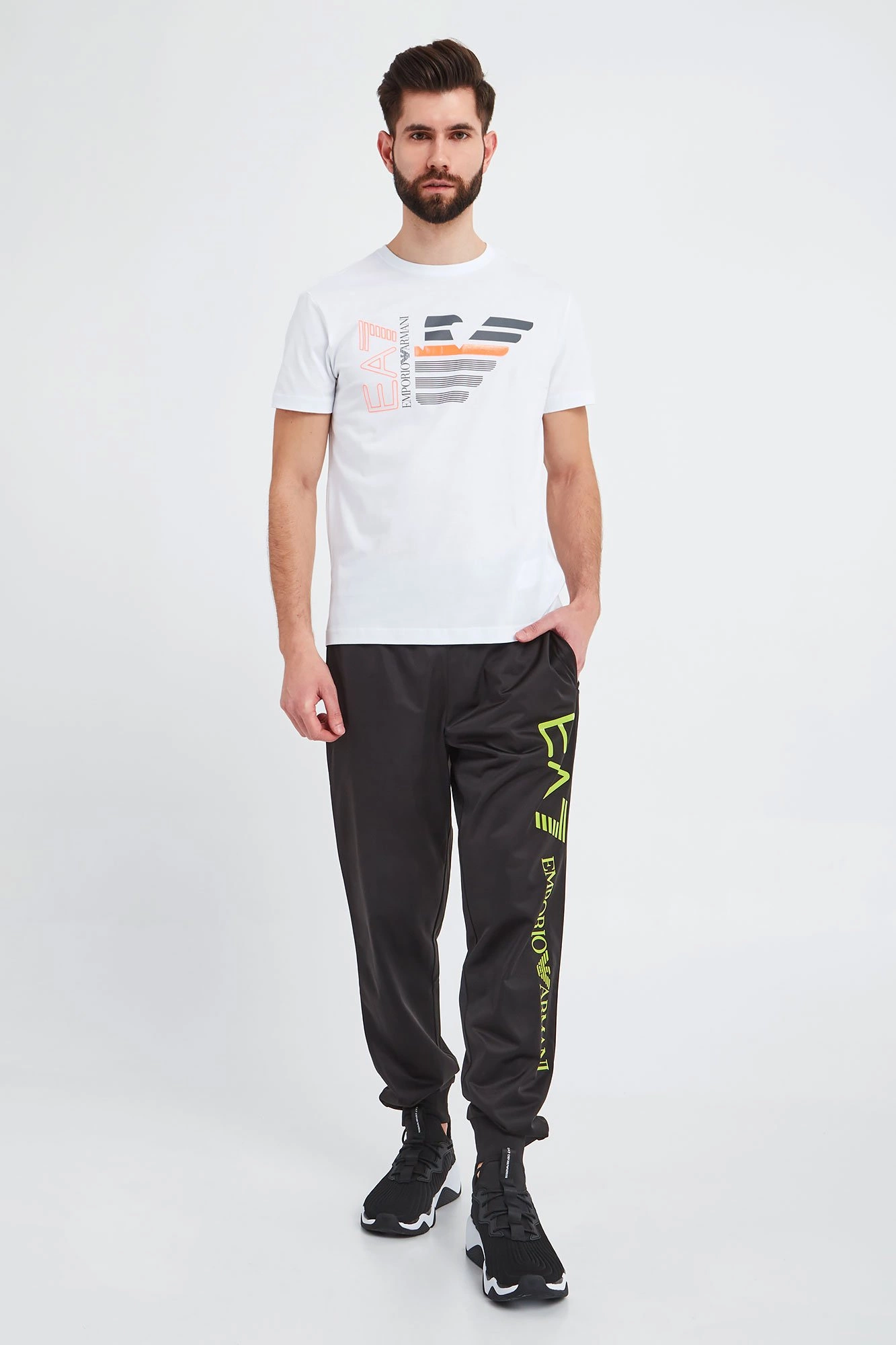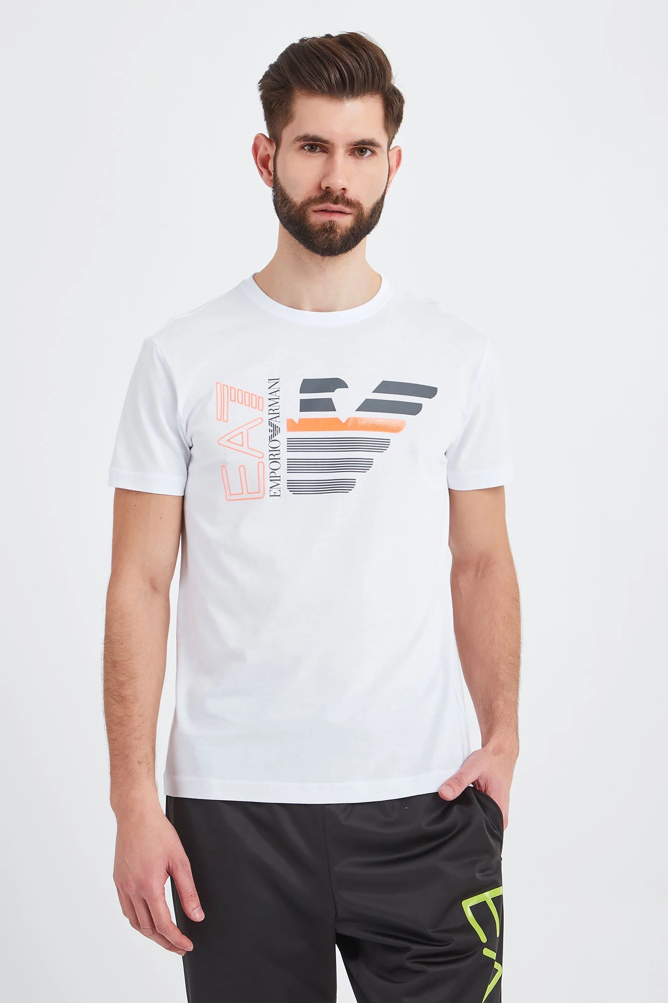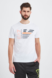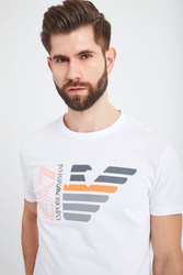Biały t-shirt marki EA7 Emporio Armani o lekko luźniejszym fasonie. Dekolt typu o-neck. Z przodu duży pomarańczowo-grafitowy nadruk nazwy i logo marki. Z tyłu logo marki w postaci pomarańczowego nadruku. Zdobienia tworzą oryginalny kontrast kolorystyczny. T-shirt wykonany z wysokiej jakości, miękkiej, bawełny.