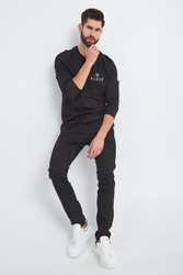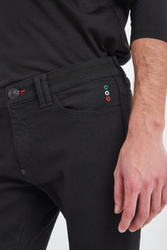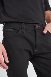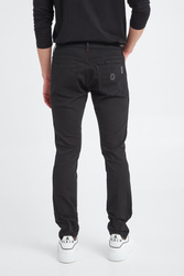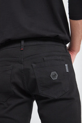Czarne jeansy marki Philipp Plein o dopasowanym fasonie. Zapinane na zamek i sygnowany logo guzik. Model z sześcioma kieszeniami. Zdobione skórzaną aplikacją z logo, naszywkami z nazwą marki i wielokolorowym haftem w kolorach włoskiej flagi. Jeansy wykonane ze szczególną dbałością o detale z wysokiej jakości bawełny z dodatkiem elastycznych włókien.