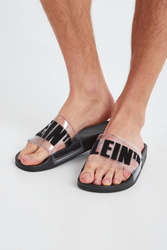 Czarne klapki marki Philipp Plein. Nosek okrągły. Transparentny szeroki pas zdobiony welurową aplikacją nazwy marki. Wyściółka i podeszwa z tłoczeniem nazwy marki. Klapki wykonane z wysokiej jakości materiałów z zachowaniem najwyższych standardów wykonania. Oryginalne i idealne dopełnienie letnich stylizacji.