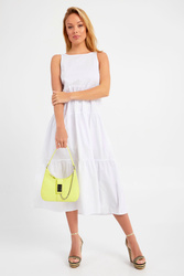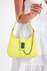 Skórzana torebka w cytrynowym kolorze marki Patrizia Pepe. Jednokomorowa. Zapinana na zamek. Wewnątrz dwie kieszenie, w tym jedna niezapinana. Z przodu srebrne zdobienia w postaci łańcuszka i klamry z tłoczeniem nazwy i charakterystycznym logo marki. Klamra imituje efektowne, obracane zapięcie. Szeroki uchwyt pozwala na noszenie torebki na ramieniu lub w dłoni. Wnętrze torebki wyścielone brązową podszewką w złoty haft logo marki. Torebka wykonana z wysokiej jakości, tłoczonej, skóry naturalnej. W komplecie worek przeciwkurzowy. Ponadczasowa elegancja uzupełniona subtelnym rockowym sznytem.