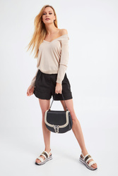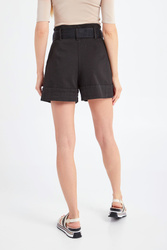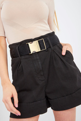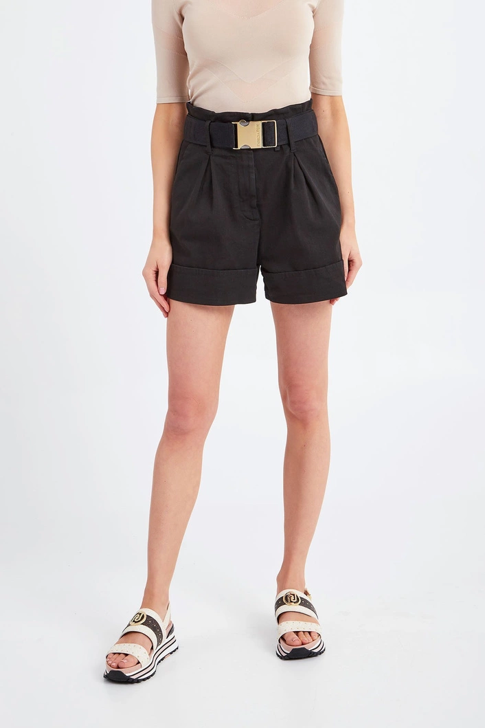 Krótkie jeansowe spodenki marki Patrizia Pepe w czarnym kolorze. Fason paperbag. Zapinane na zamek i guzik. W komplecie czarny, logowany pasek z taśmy rypsowej, zapinany metalową, sygnowaną klamrą. Model z dwoma kieszeniami. Nogawki wykończone zakładką. Fason idealny dla niemalże każdej sylwetki, komfortowy i kobiecy. Doskonała baza do casualowych stylizacji.