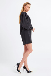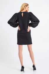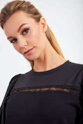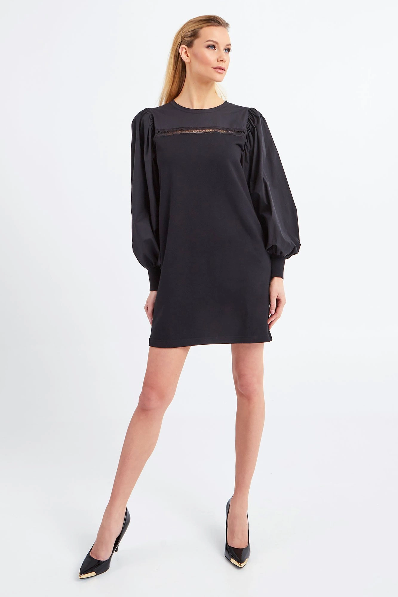 Oryginalna sukienka marki Karl Lagerfeld w czarnym kolorze. Krój regular fit, długość mini. Dekolt typu o-neck. U góry ażurowa wstawka z haftowanym napisem w postaci nazwy marki. Bufiaste rękawy, u dołu ściągacze. Z tyłu wycięcie w kształcie łezki. Ponadczasowa i bardzo kobieca.