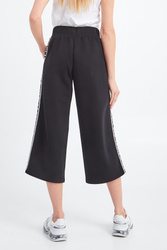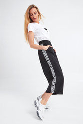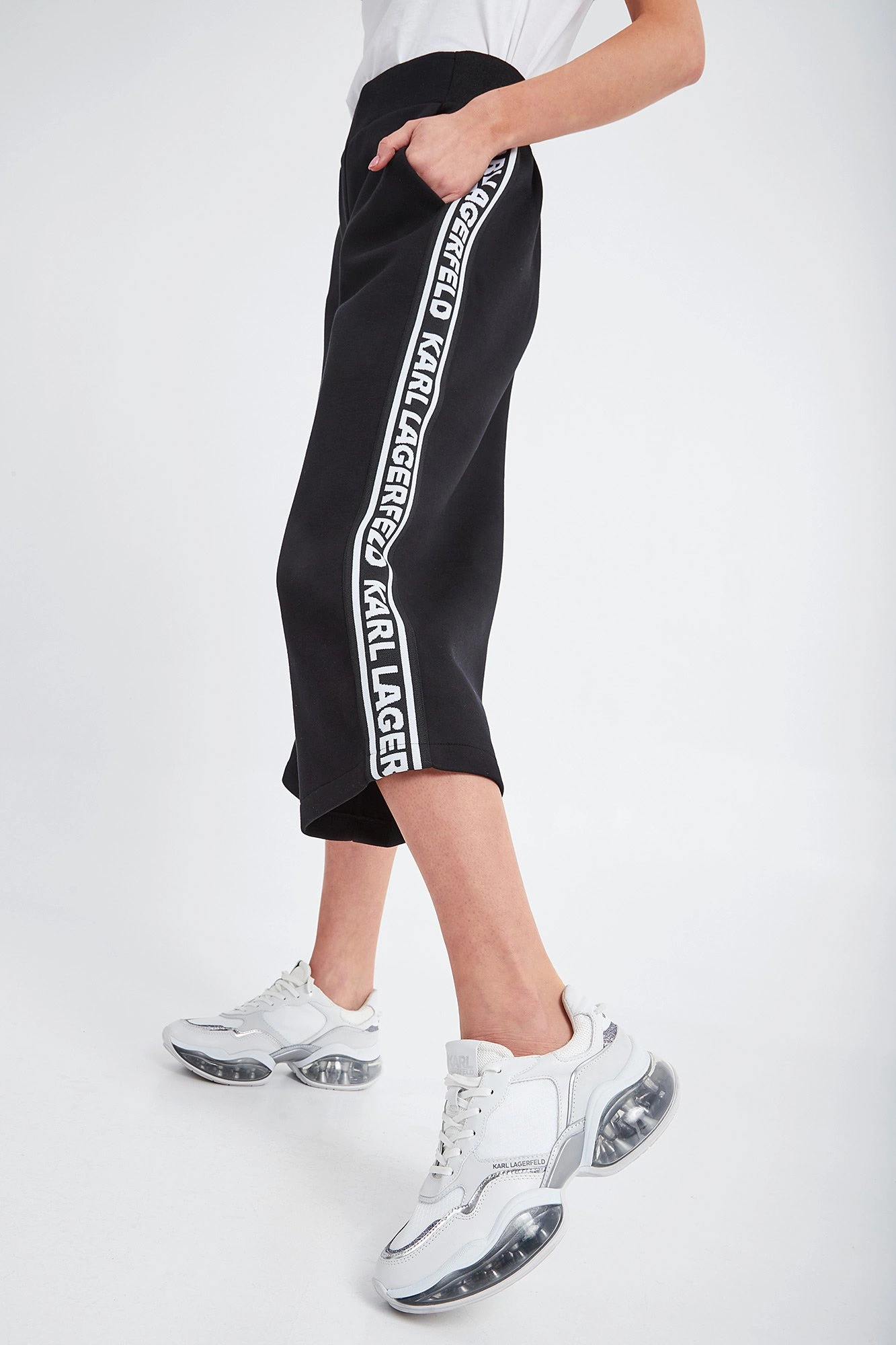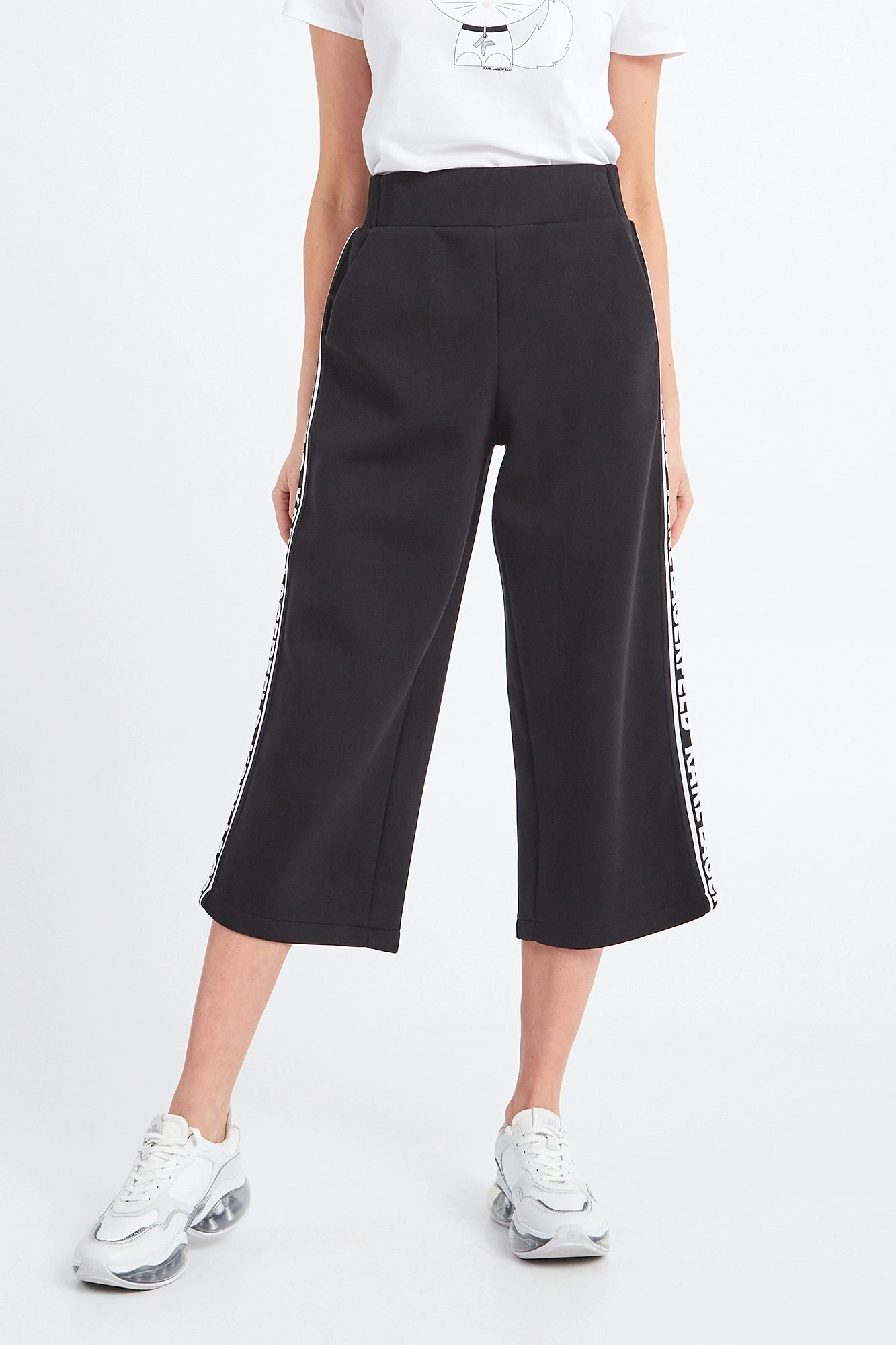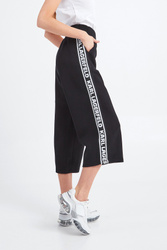 Spodnie marki Karl Lagerfeld typu kuloty w czarnym kolorze, wykonane z materiału imitującego neopren. Model z dwoma kieszeniami. Szeroki, elastyczny pas, wykończony częściowo ściągaczem. Luźne nogawki o długości 7/8, zdobione po bokach elastycznym, kontrastowym lampasem, sygnowanym nazwą marki. Designerska i stylowa baza do miejskich stylizacji.