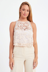 Koronkowy top marki Patrizia Pepe w jasnobeżowym kolorze. Fason regular fit. Dekolt typu o-neck. Zapinany z tyłu na niewielki guzik z charakterystycznym logo marki. Pod zapięciem ozdobne rozcięcie. Ramiączka z ringami w kolorze postarzanego złota. Dół asymetryczny. Top wykonany z wysokiej jakości bawełny. Bardzo kobiecy, idealny do letnich, romantycznych stylizacji.