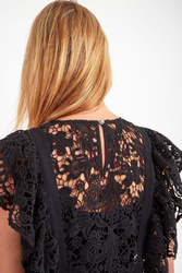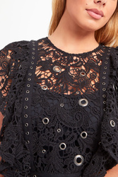 Koronkowy top marki Patrizia Pepe w czarnym kolorze. Na całości zdobienie ringami. Fason relaxed fit. Dekolt typu o-neck. Zapinany z tyłu na niewielki guzik z charakterystycznym logo marki. Pod zapięciem ozdobne rozcięcie. Z przodu falbaniaste wstawki, tworzące krótki rękaw. Dół wykończony lamówką zdobioną ringami. Top wykonany z wysokiej jakości bawełny. Bardzo kobiecy, idealny do letnich, romantycznych stylizacji.