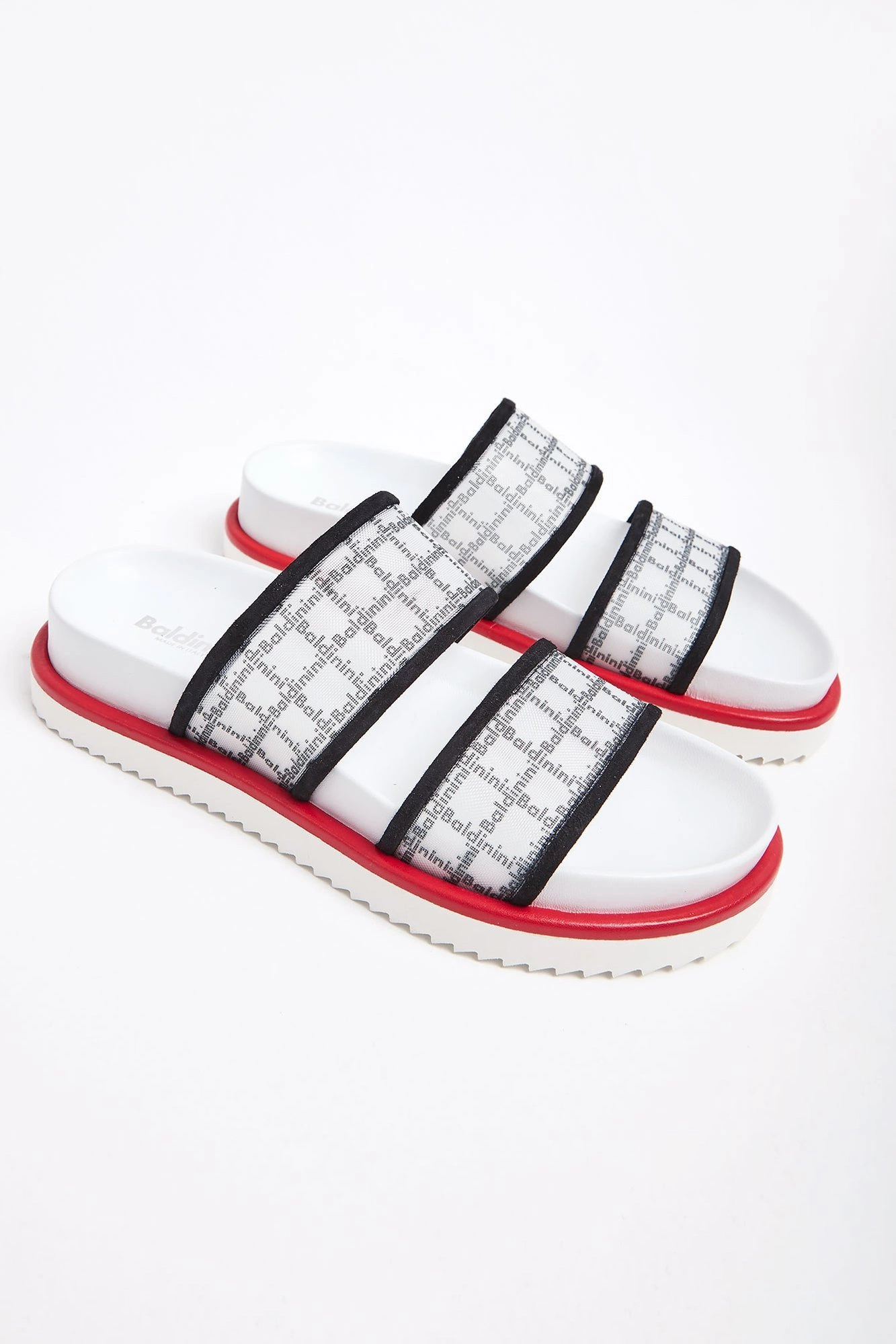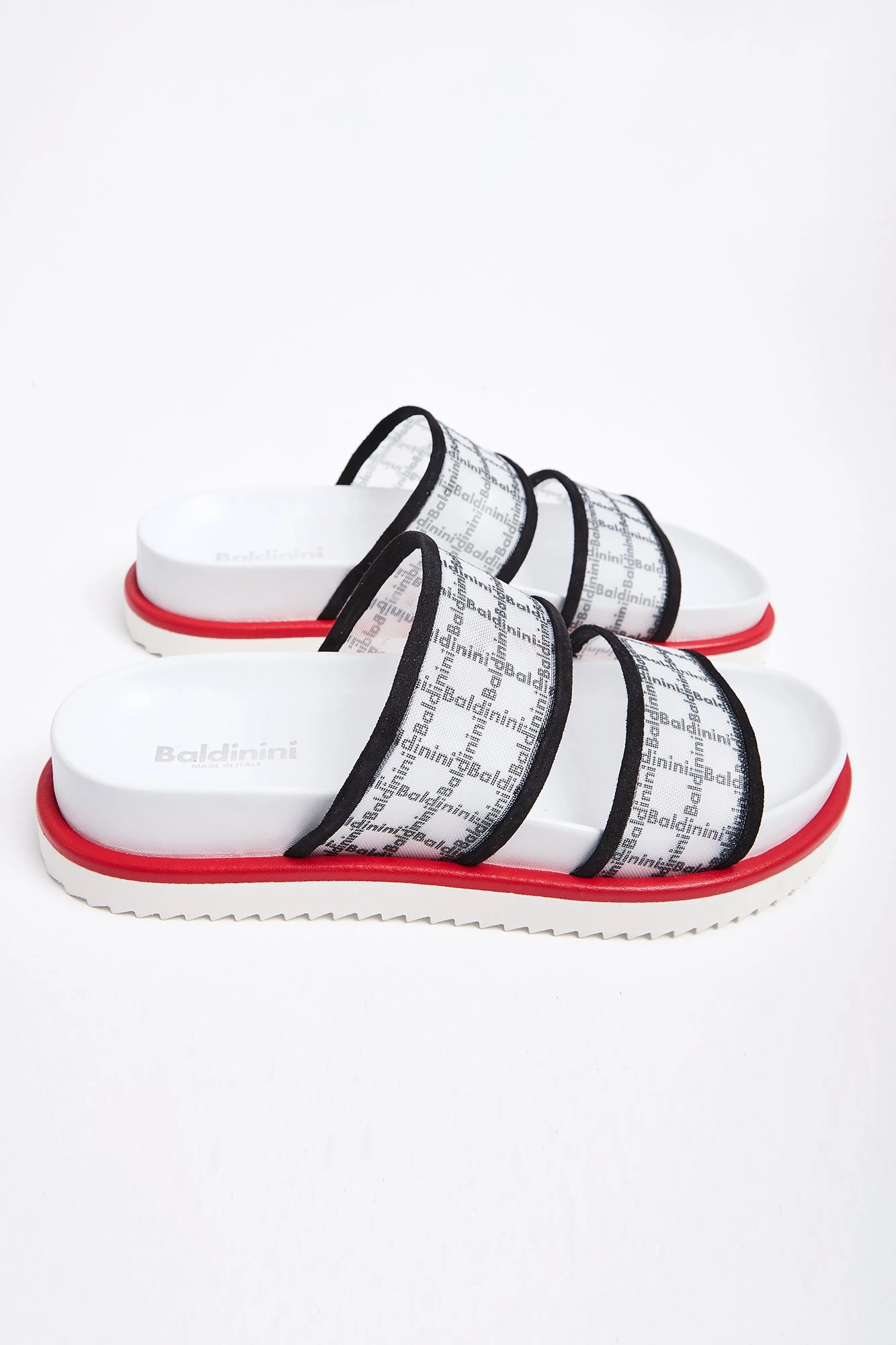 Białe klapki marki Baldinini. Nosek okrągły. Z przodu dwa szerokie paski w postaci siatki. Na niej czarny wzór nazwy marki. Klapki wykonane z wysokiej jakości materiału. Podeszwa biało-czerwona z wysokogatunkowego tworzywa. Wysokość ok. 2 cm. W komplecie worek przeciwkurzowy.