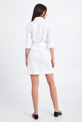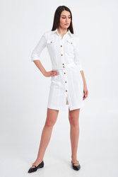 Sukienka marki Pinko w białym kolorze. Fason regular fit. Zapinana z przodu na złote napy. Dekolt wykończony prostym kołnierzykiem. Z przodu dwie patki z napami, imitujące kieszenie. Rękawy długości 3/4, wykończone szerokim mankietem z rozcięciem. Z przodu i z tyłu przeszycia optycznie wysmuklające sylwetkę i podkreślające kształt. W komplecie pasek zapinany na napę. Sukienka wykonana z wysokiej jakości dzianiny. Długość mini. Kobieca, idealna jako letnia stylizacja.