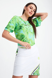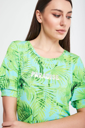 Elastyczny T-shirt SPORTALM Lou Print w charakterystyczny dla tegorocznej kolekcji roślinny motyw. Dekolt typu o-neck. Na przodzie srebrny nadruk. z tyłu, na linii karku metalowa zawieszka z logo marki. Struktura materiału i oryginalne wzornictwo nadają koszulce unikatowego połączenia sportowego charakteru z kobiecą stylistyką.
