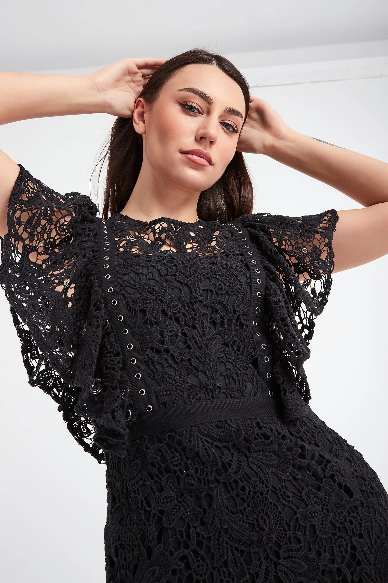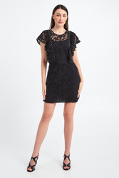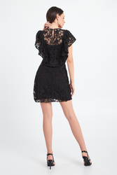 Koronkowa sukienka marki Patrizia Pepe w czarnym kolorze. Przód zdobiony metalowymi ringami, nadającymi rockowego charakteru. Górna część podkreślona beżowymi lamówkami. Falbaniaste wstawki, tworzą krótki rękaw. Zapinana z boku na zamek oraz z tyłu na logowany guzik. Fason regular fit. Długość mini. Bardzo kobieca, letnia sukienka, z nutą romantyzmu.