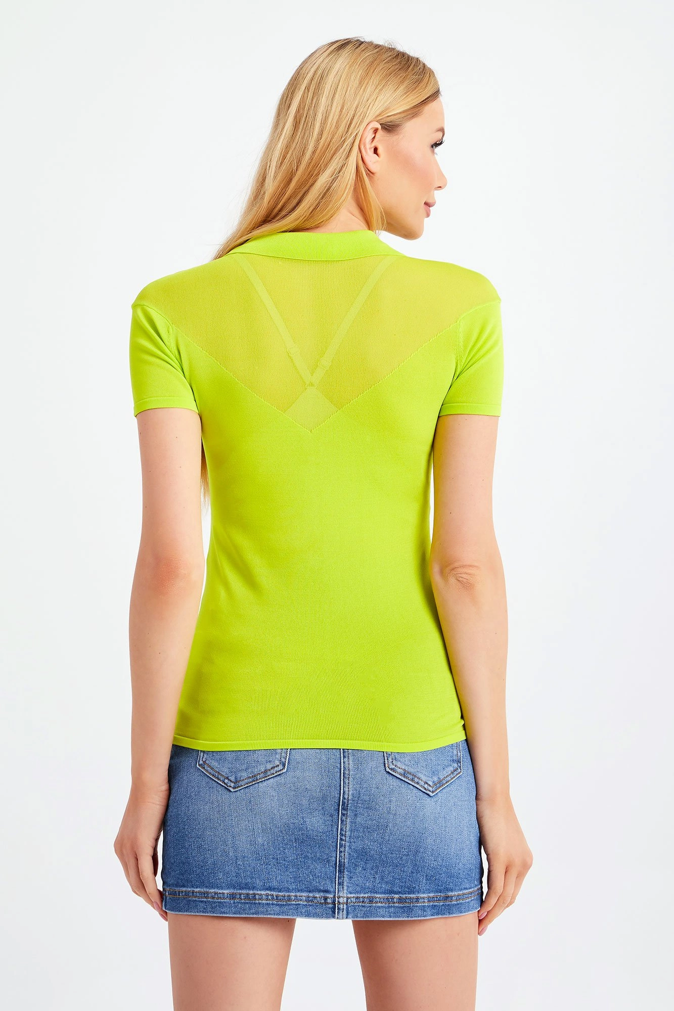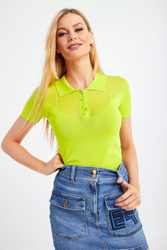 Koszulka polo z krótkim rękawem marki Patrizia Pepe w limonkowym kolorze. Fason slim fit. Zapinany na guziki ze stopką. Kołnierzyk prosty. Z przodu i z tyłu transparentna wstawka, optycznie wysmuklająca sylwetkę. Polo wykonane z lekkiej i przewiewnej mieszanki wiskozy.