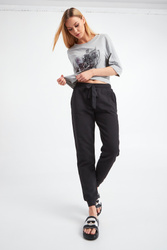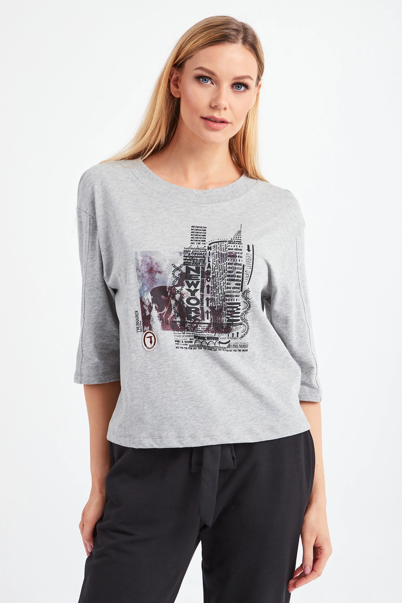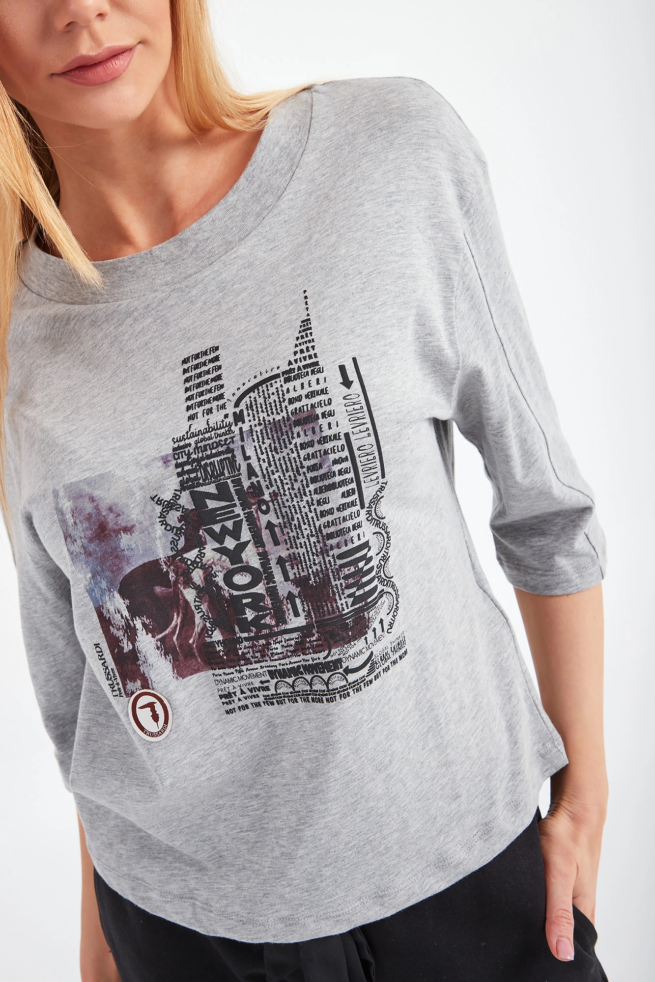 T-shirt marki Trussardi w kolorze szarego melanżu. Fason oversize. Okrągły dekolt typu o-neck wykończony szerokim ściągaczem. Z przodu wielokolorowy nadruk z nazwą marki i charakterystycznym dla niej motywem charta. Czarny nadruk delikatnie przestrzenny. Na rękawach przeszycia. T-shirt wykonany z wysokiej jakości, miękkiej w dotyku bawełny. Idealny jako baza do casualowych stylizacji.