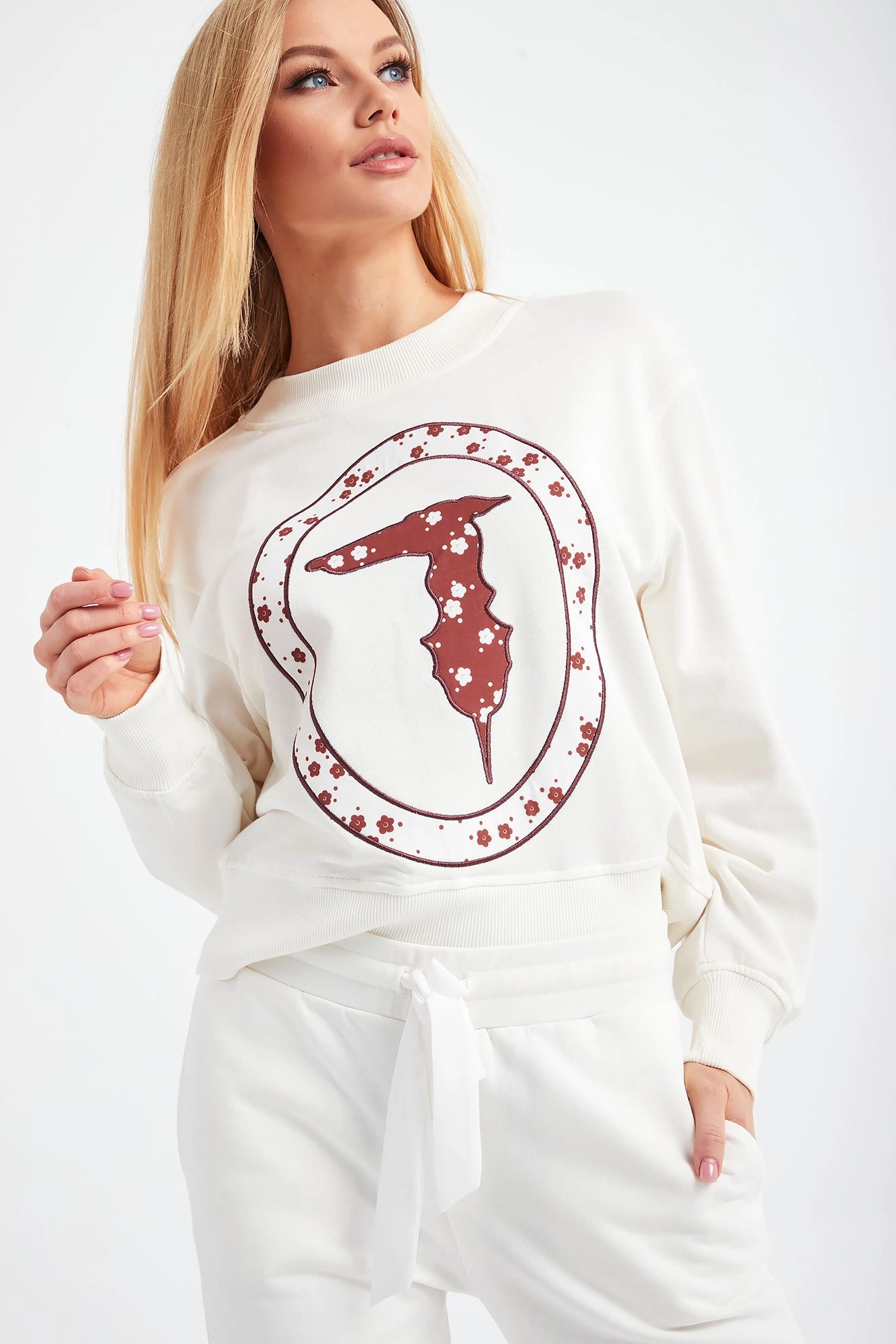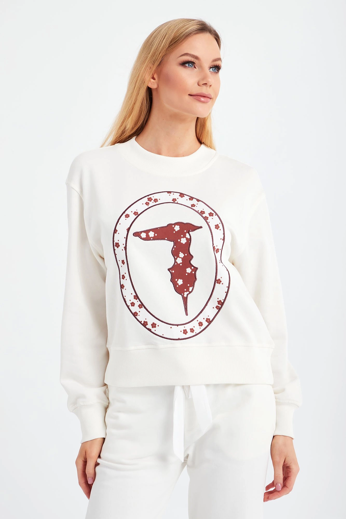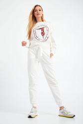 Bluza marki Trussardi w kolorze ecru. Luźniejszy fason. Dekolt okrągły typu o-neck. Z przodu duża aplikacja charakterystycznego logo marki w postaci charta w biało-brązowym kolorze. Rękawy, dół i dekolt wykończone szerokim ściągaczem. Bluza wykonana z wysokiej jakości bawełny.