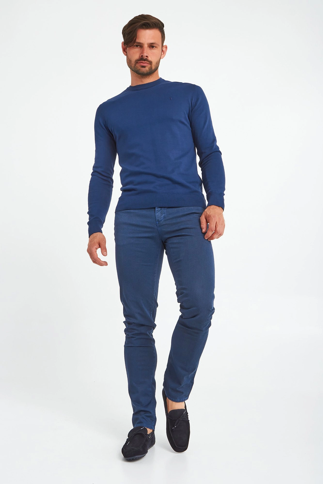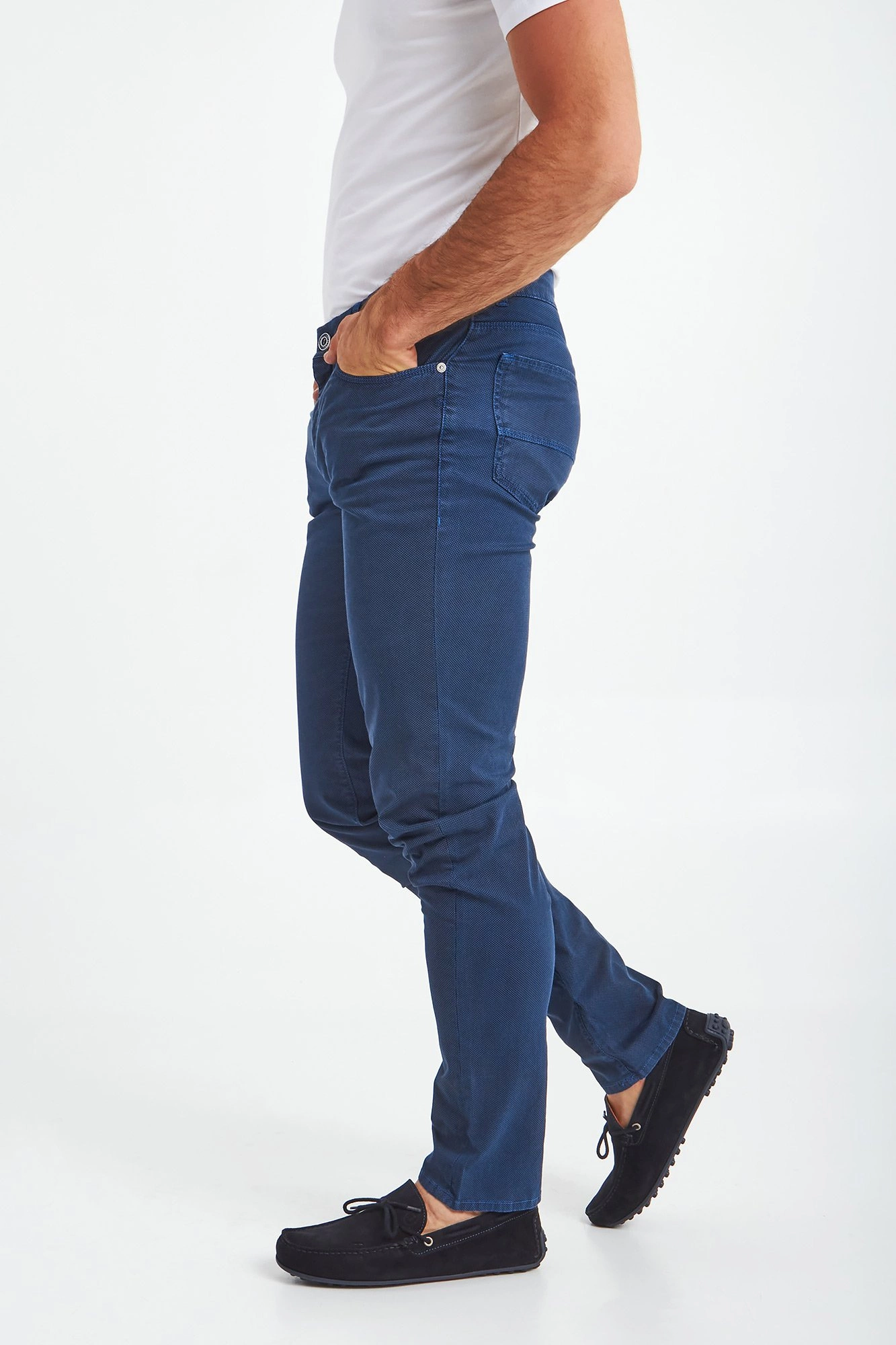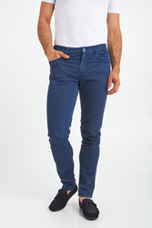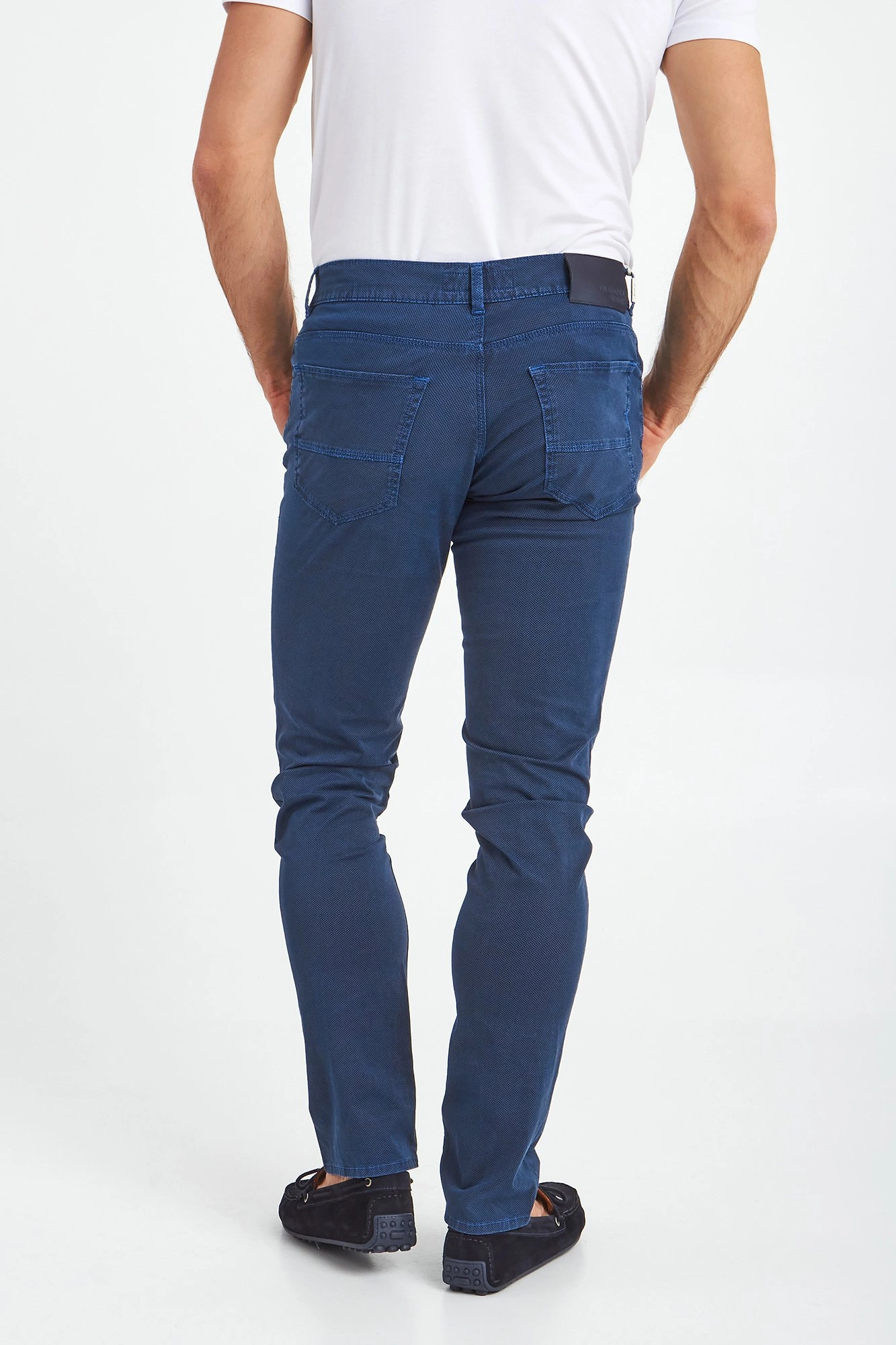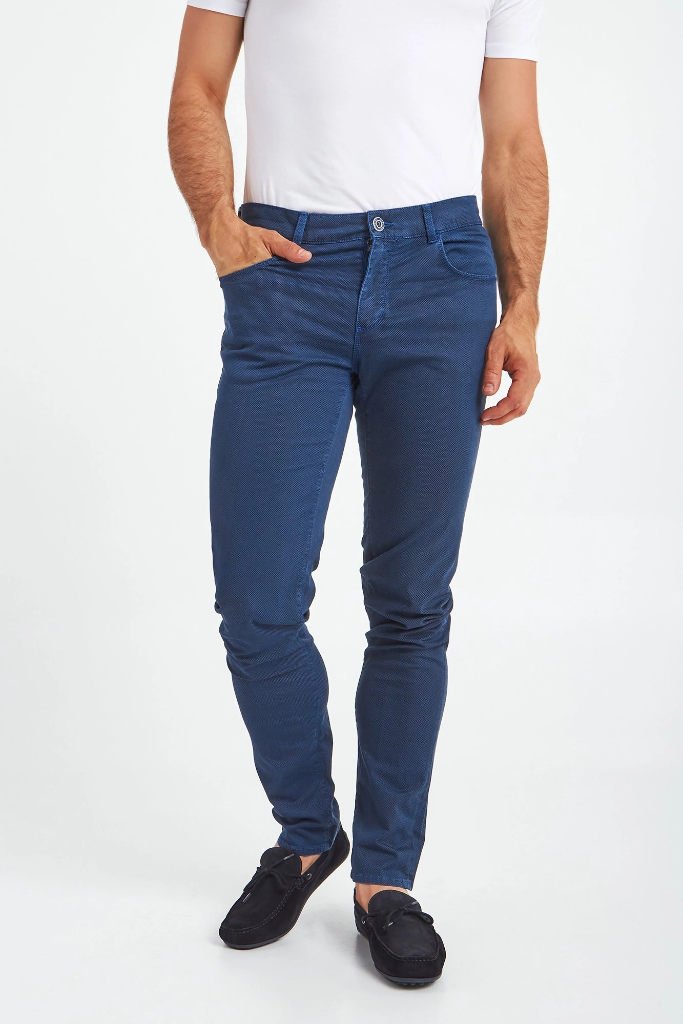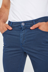 Granatowe spodnie Close 370 marki Trussardi. Na całości drobny geometryczny wzór w niebieskim kolorze. Delikatnie dopasowany fason z prostymi nogawkami. Zapinane na zamek i sygnowany guzik. Model z pięcioma kieszeniami. Z tyłu aplikacja z tłoczeniem nazwy marki. Oryginalnego charakteru dodają niebieskie przeszycia. Spodnie wykonane z wysokiej jakości bawełny z dodatkiem elastycznych włókien. Oryginalny element męskich stylizacji o różnym stopniu formalności.