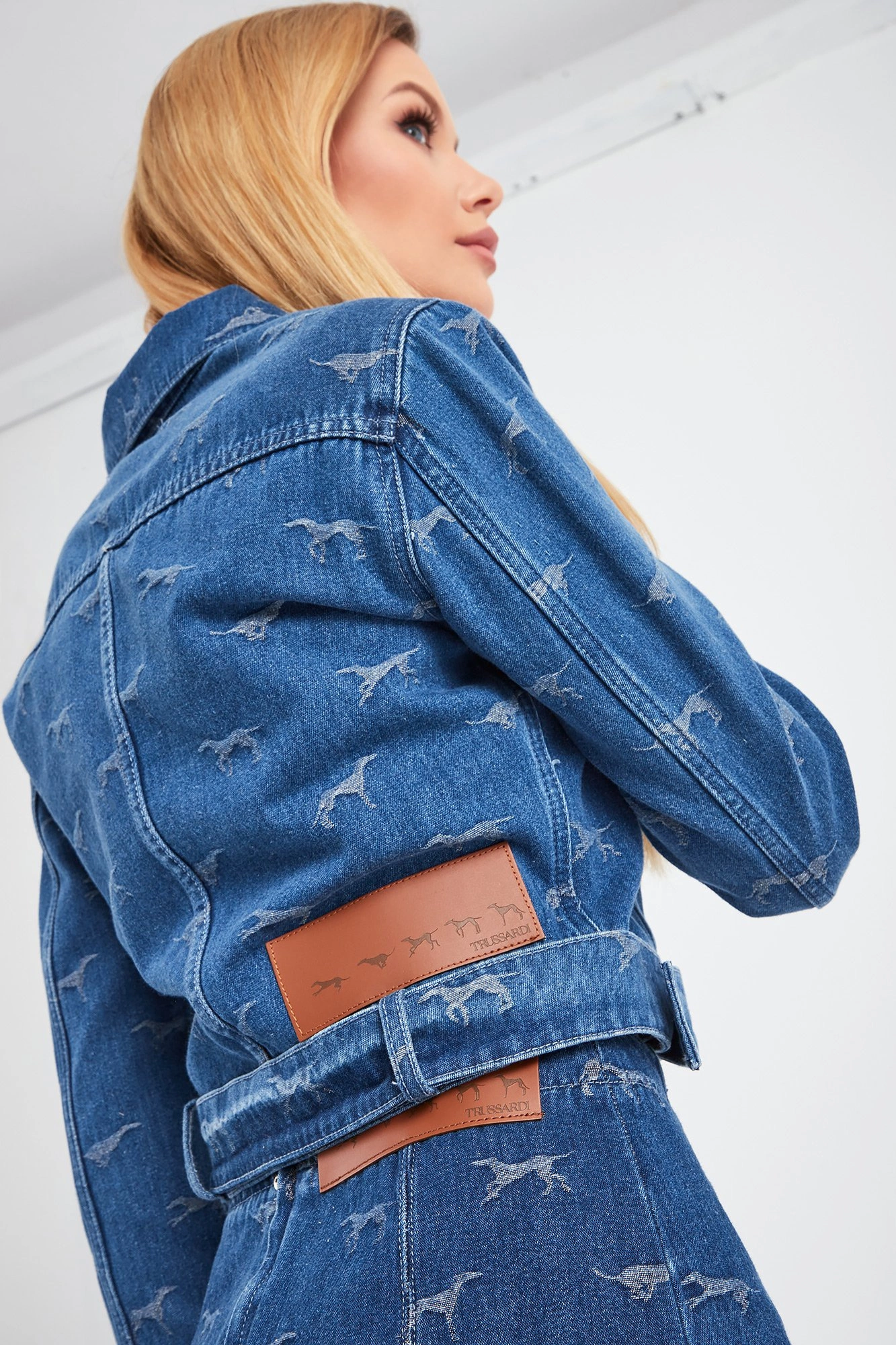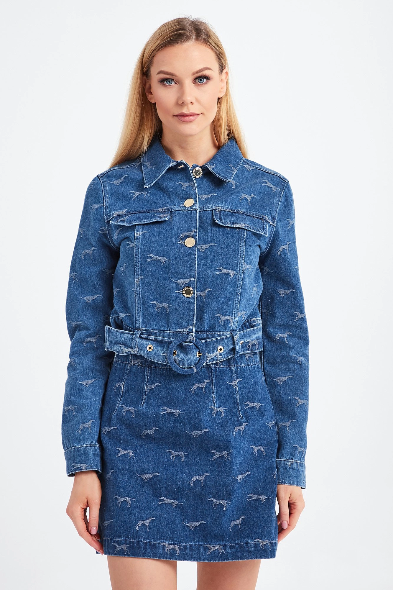 Jeansowa katana marki Trussardi w niebieskim kolorze. Na całości charakterystyczny dla marki wzór charta. Luźniejszy fason o modnym kroju cropped. Zapinana na złote guziki sygnowane nazwą marki. Z przodu dwie patki imitujące kieszenie. Z tyłu duża brązowa aplikacja z nazwą i logo marki. W komplecie pasek. Zapinany na okrągłą klamrę. Rękawy wykończone prostym mankietem, zapinanym na złoty guzik. Katana wykonana z wysokiej jakości bawełny z dodatkiem delikatnie elastycznych włókien.
