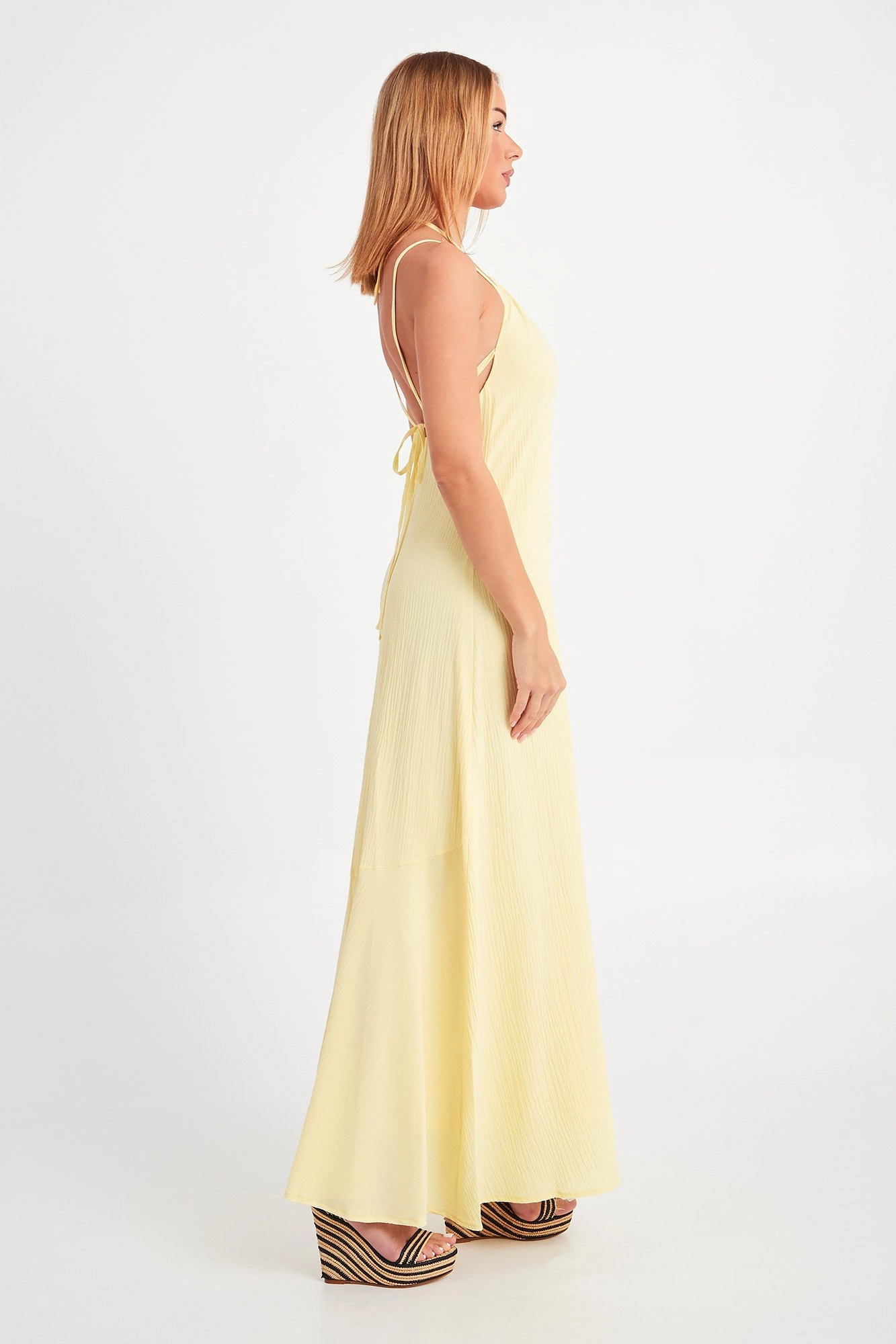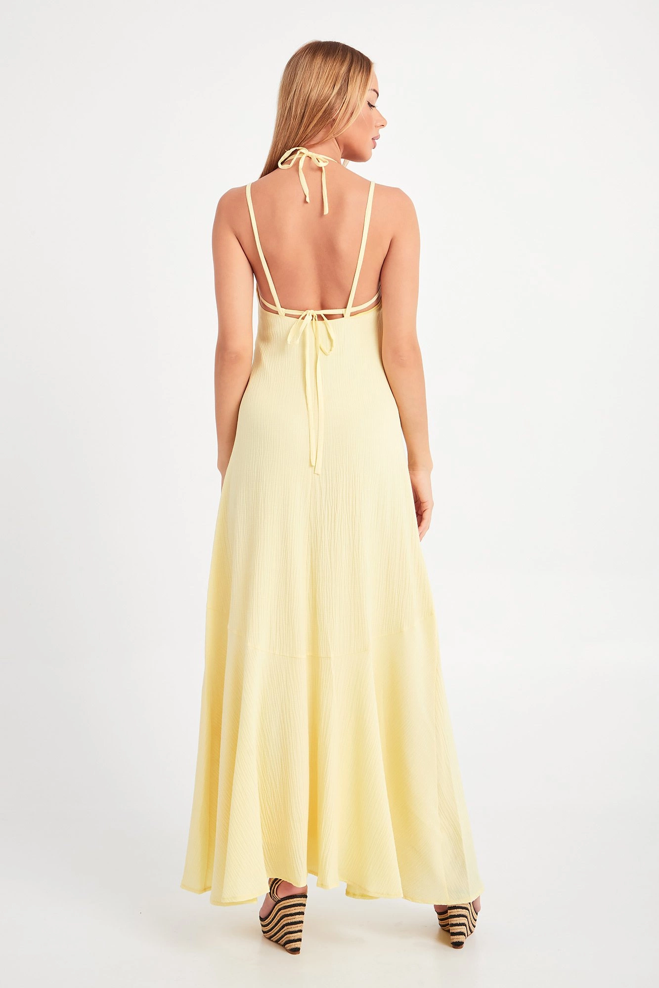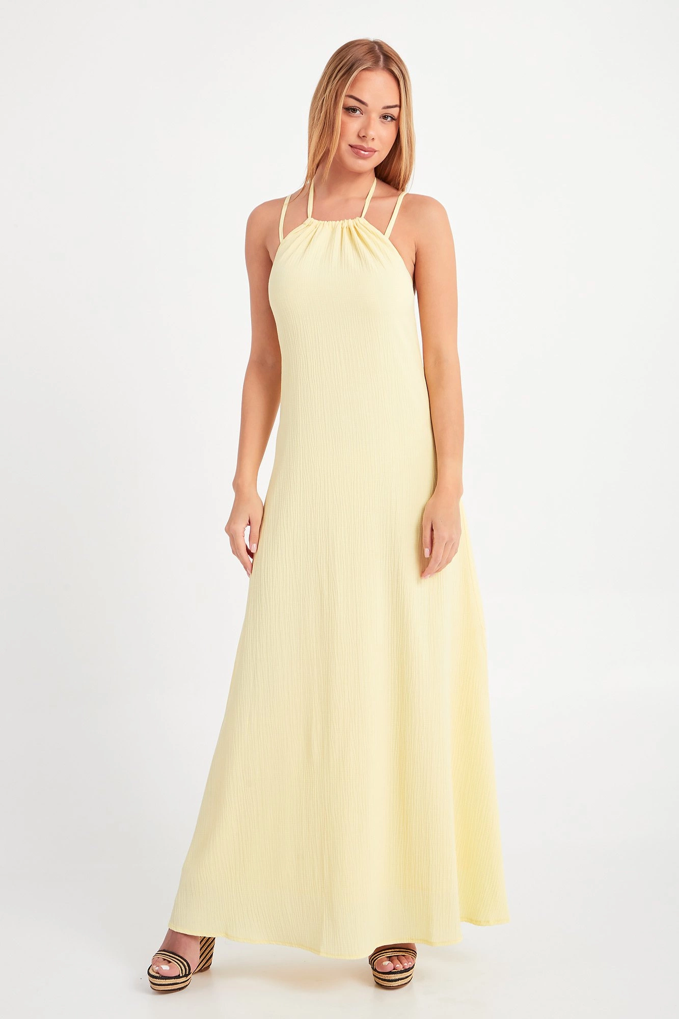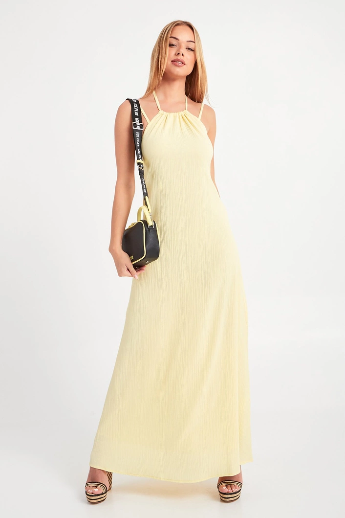 Letnia sukienka marki Trussardi w żółtym kolorze. Na całości wąskie paski, nadające ciekawej struktury. Lekko luźniejszy fason relaxed fit. Wiązana na szyi i plecach za pomocą troczków. Dekolt typu halter. Podszewka gładka, w żółtym kolorze. Sukienka wykonana z wysokiej jakości materiałów. Zwiewna, lekka. Fantastyczna propozycja jako letnia lub plażowa stylizacja.