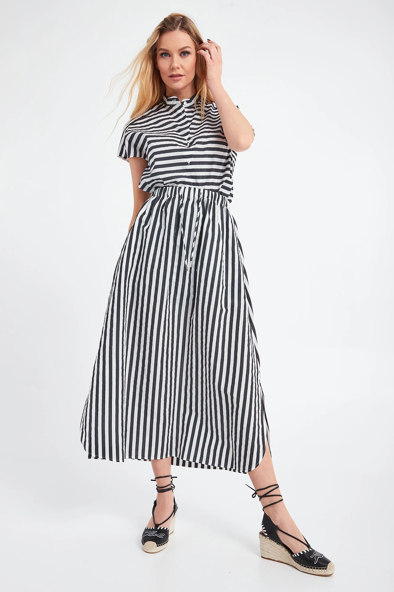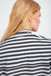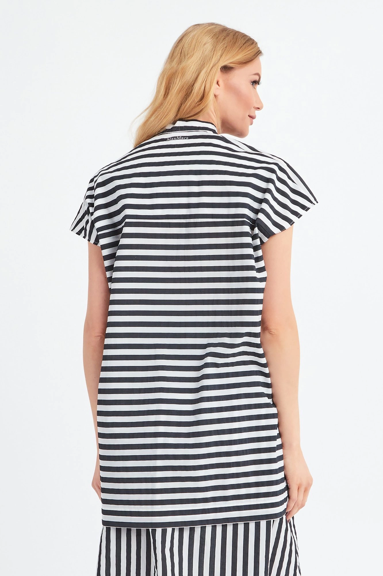 Bluzka marki Max Mara z kolekcji Beachwear. W biało-czarne, poziome pasy, o nieco luźniejszym, długim, prostym kroju. Bez rękawów, zapinana na małe, białe guziki. Okrągły dekolt, kołnierz ze stójką. Z boków niewielkie rozcięcia. Z tyłu, na linii karku, mieniący się, srebrny nadruk z nazwą marki. Wykonana z delikatnego, przyjemnego w dotyku materiału. Ponadczasowa, idealna jako baza do każdej stylizacji. Jej wzór nada całości elegancji i nietuzinkowości.