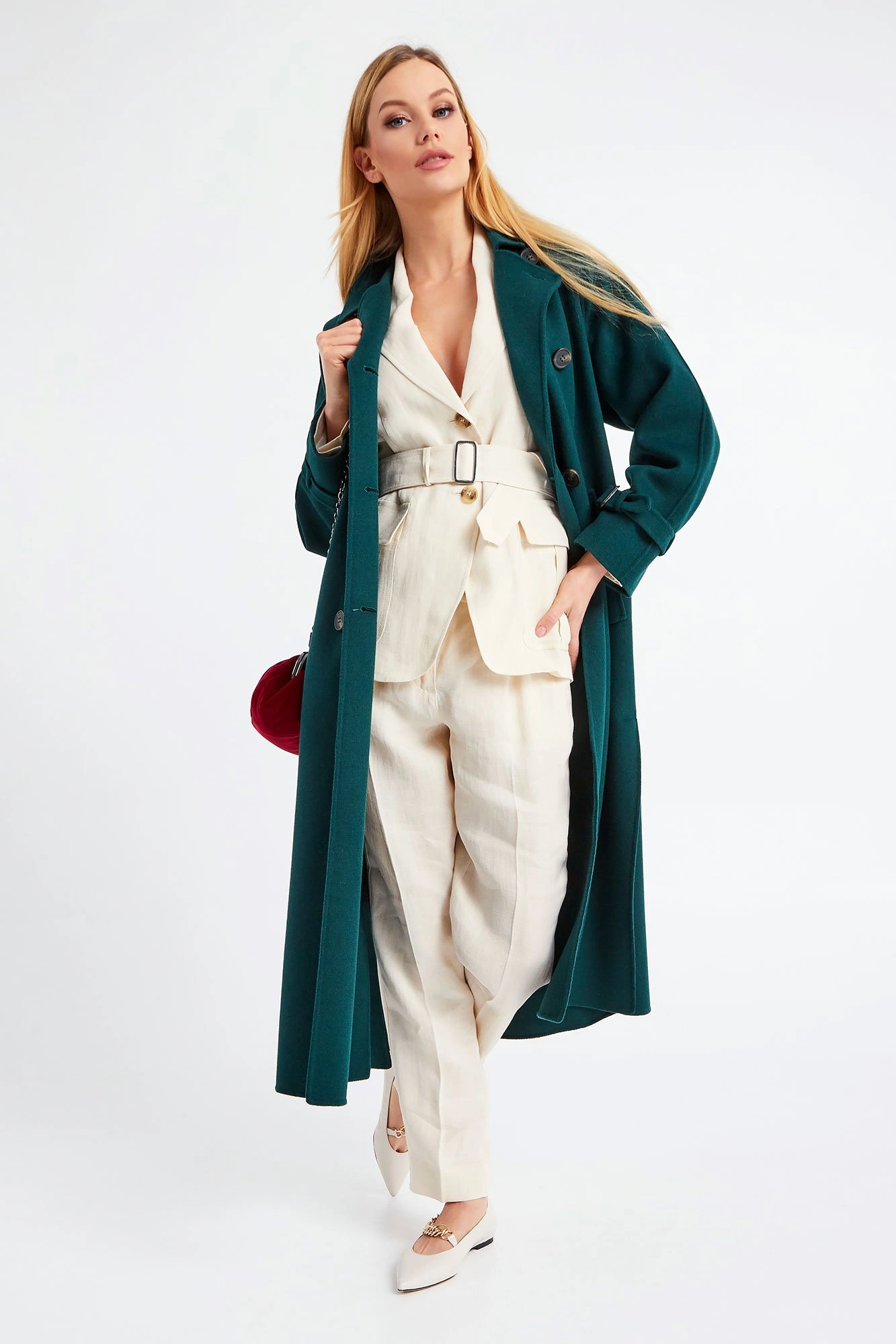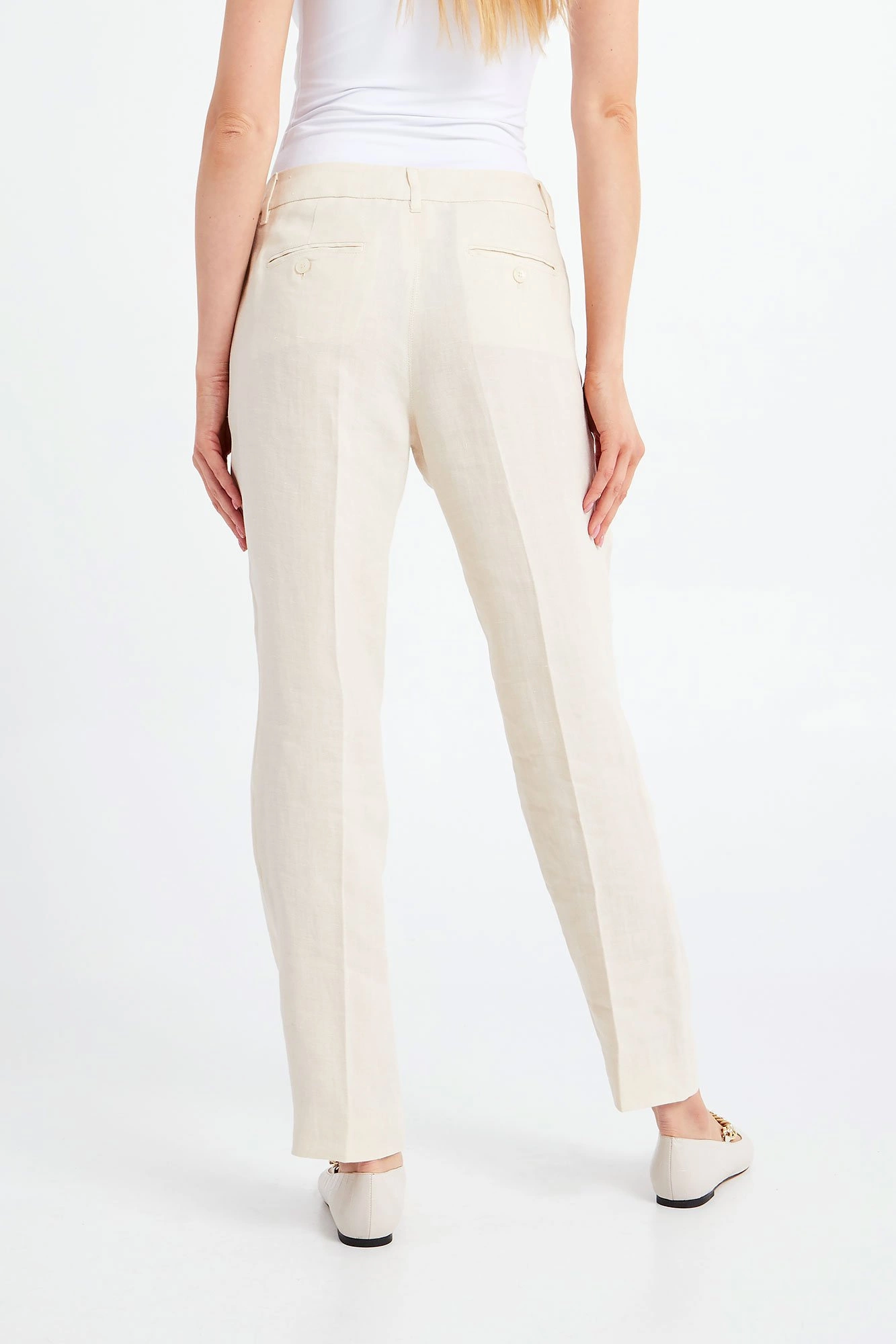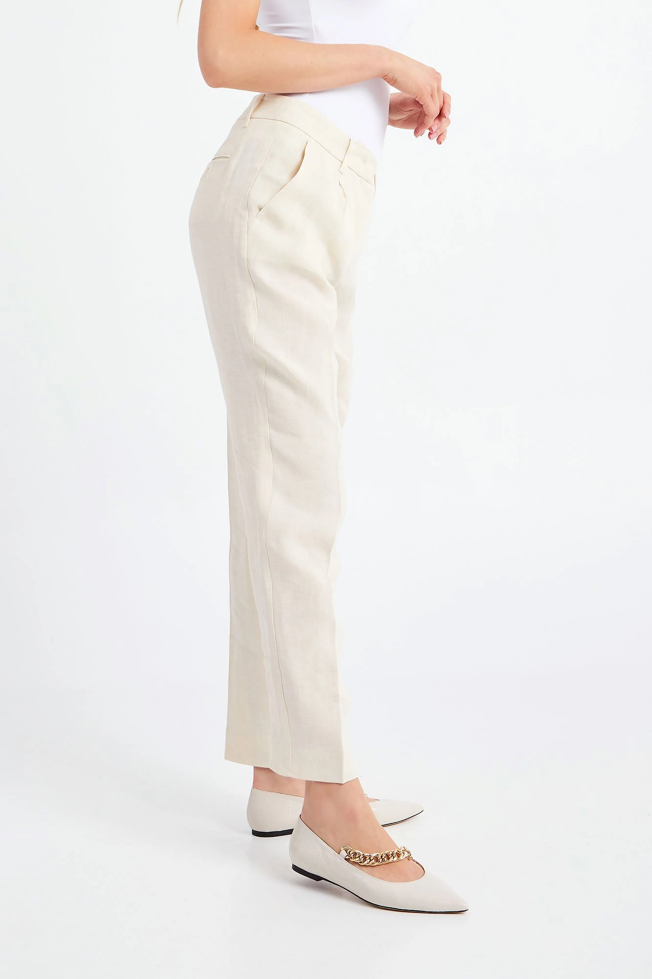 Beżowe cygaretki. Wykonane z najwyższej jakości lnu. Zapinane na zamek i szlufkę. Z przodu dwie niezapinane kieszenie. Nogawki luźne z kantem. Z tyłu dwie kieszenie bez patki, zapinane na jeden guzik. Idealne zarówno do eleganckich jak i casualowych stylizacji.