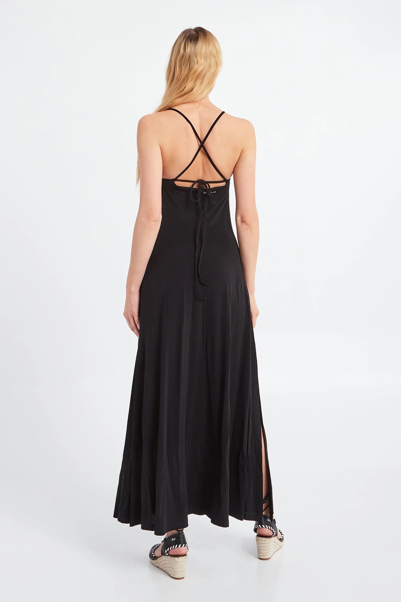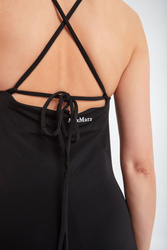 Sukienka marki Max Mara z kolekcji Beachwear. Czarna, długa, o trapezowym kroju. Okrągły dekolt i cienkie, zawiązywane ramiączka wykończone z przodu ozdobnymi, metalowymi kółkami. Z tyłu skrzyżowane ramiączka oraz głęboki dekolt. Dwie wpuszczane, niezapinane kieszenie. Wykonana z elastycznej, przyjemnej w dotyku, wiskozowej krepy. Sukienka bez podszewki. Klasyczna, prosta propozycja marki Max Mara Leisure, dzięki swojemu krojowi i dodatkom, nada każdej stylizacji ponadczasowości, elegancji i nietuzinkowości.