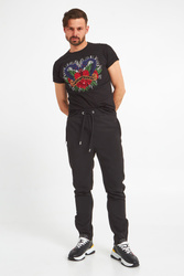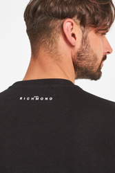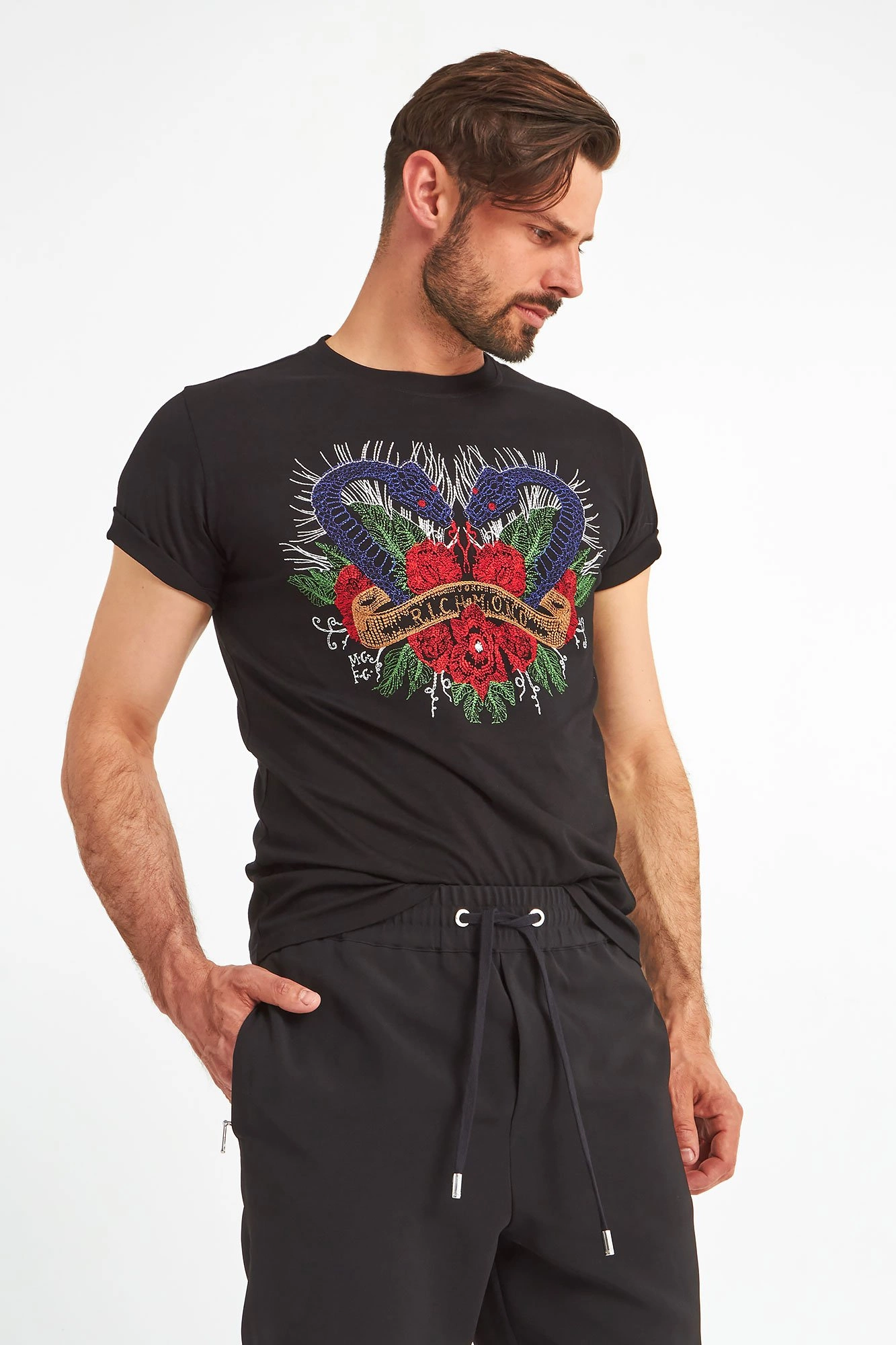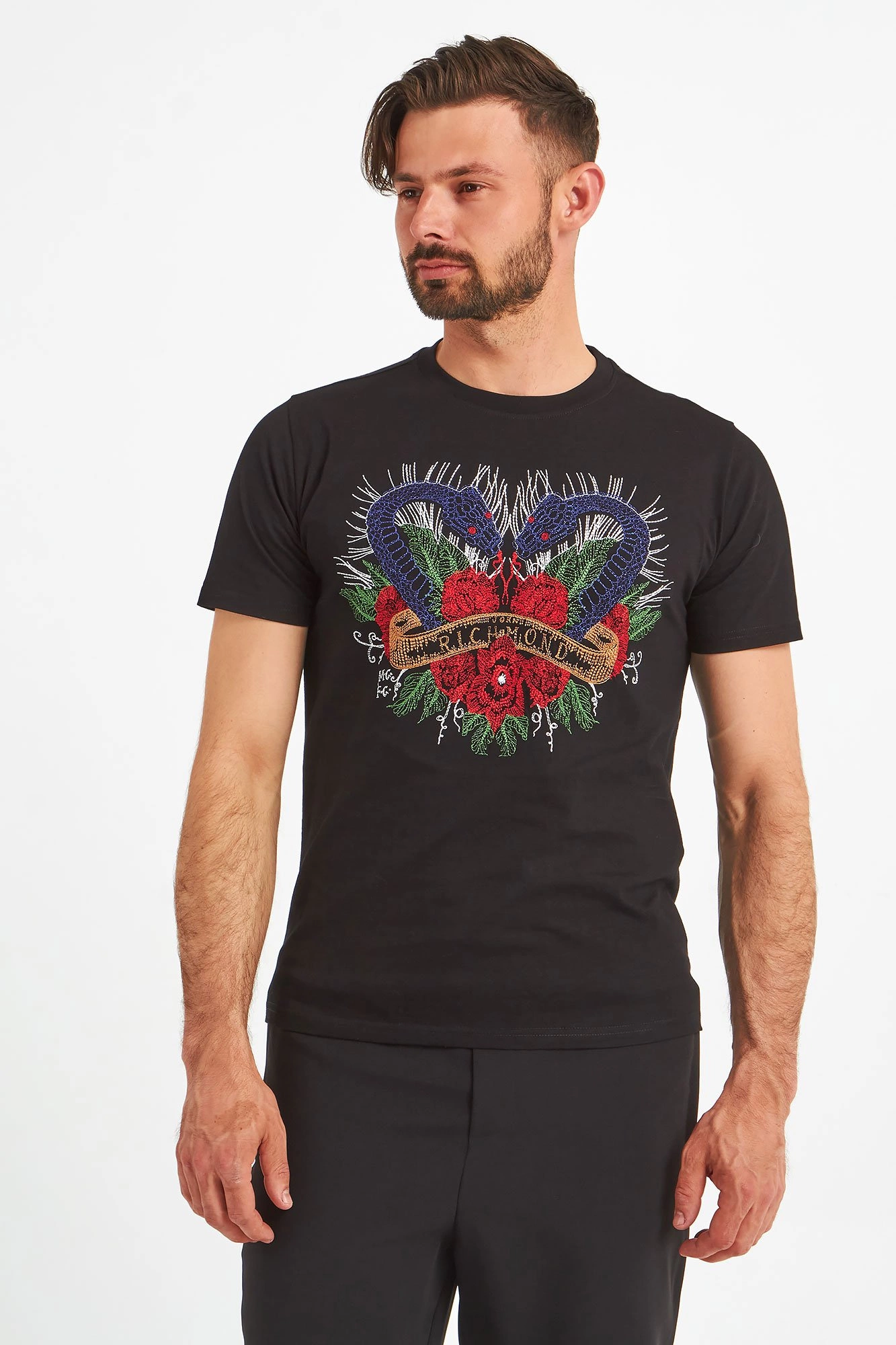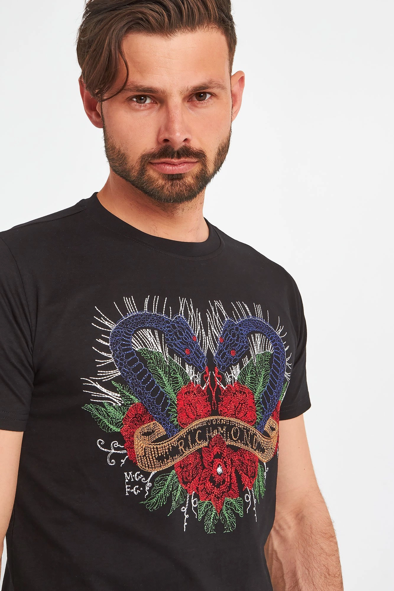 T-shirt marki John Richmond. Czarny, z kolorowymi elementami. Regularny krój. Okrągły dekolt zakończony ściągaczem. Proste, krótkie rękawy oraz dół wykończone lamówką. Z przodu pokryty ozdobnymi, kolorowymi przeszyciami z kwiatowym i wężowym motywem tworzącym kształt serca oraz logo. Na linii karku biały napis z nazwą marki. Wykonany z czystej, przyjemnej w dotyku, miękkiej bawełny. Idealnie sprawdzi się w każdej stylizacji, nadając jej charakteru, niebanalności i sprawiając, że nie będzie można przejść obok niej obojętnie.