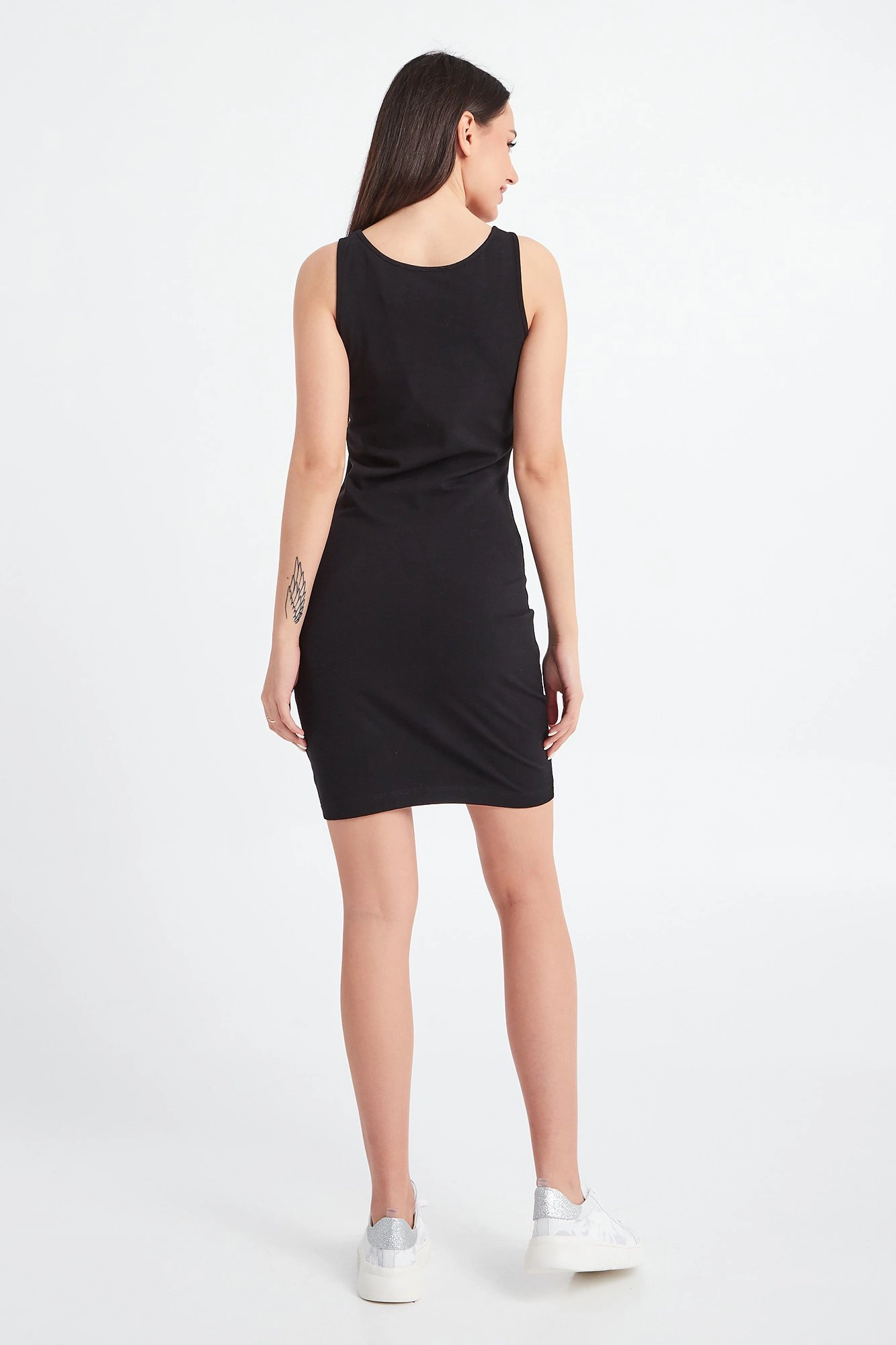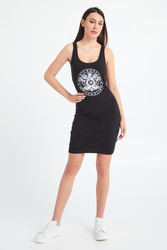 Sukienka marki John Richmond. Czarna, o prostym, dopasowanym kroju. Bez rękawów, długość do kolan. Okrągły, głęboki dekolt oraz dół sukienki wykończone lamówką. Z przodu tłoczony, biały monogram ozdobiony mieniącymi się srebrnymi i czarnymi kryształkami. Wykonana z miękkiej, przyjemnej w dotyku, elastycznej tkaniny. Klasyczna propozycja marki John Richmond sprawdzi się w każdej stylizacji i nada jej kobiecości, stylu i ponadczasowości.