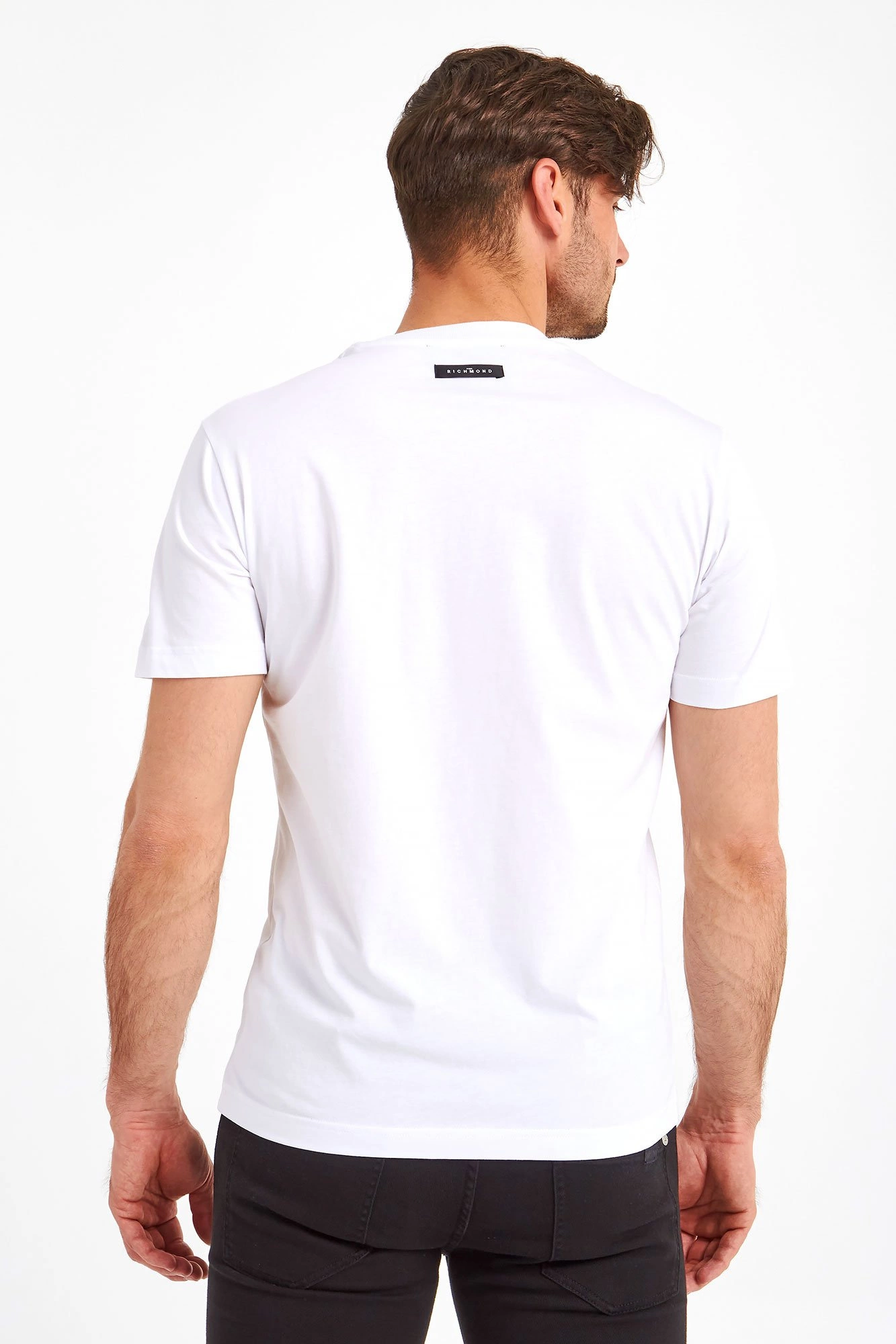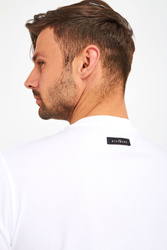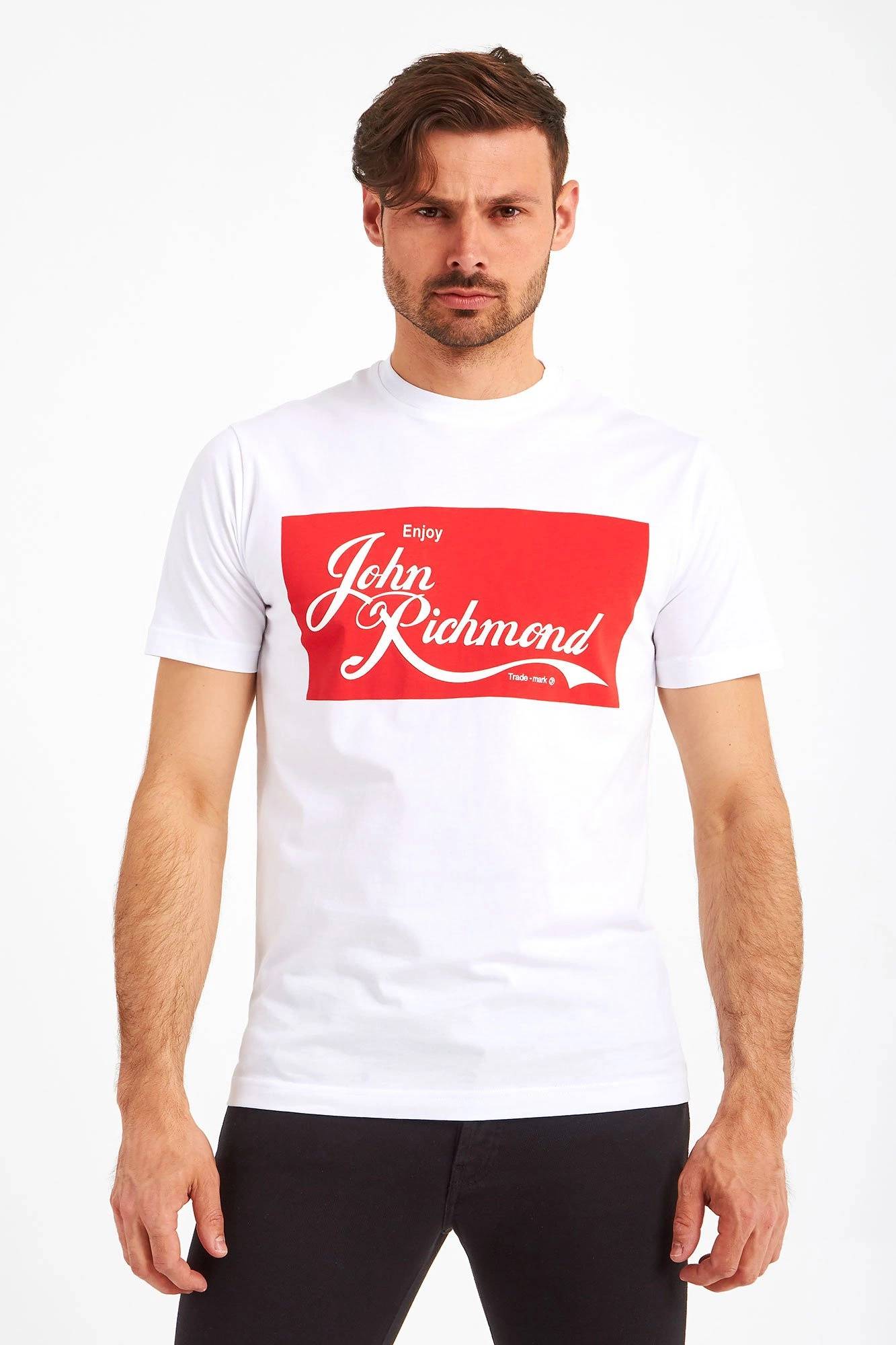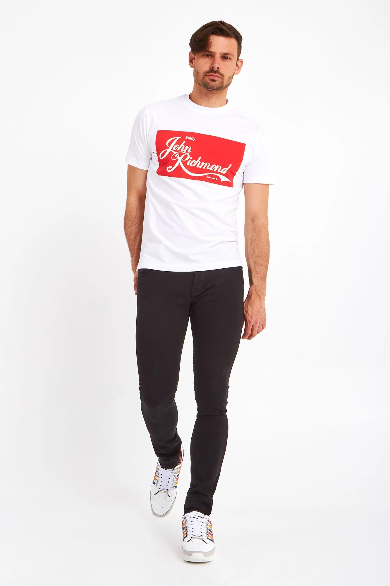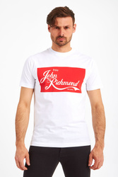 T-shirt marki John Richmond. Biały o klasycznym, regularnym kroju. Okrągły dekolt zakończony ściągaczem. Z przodu duży czerwony nadruk z białym, tłoczonym logo marki. Krótkie, proste rękawy oraz dół wykończone lamówką. Z tyłu, na linii karku wszyta czarna, ozdobna, logowana metka. Wykonany z czystej, miękkiej, przyjemnej w dotyku bawełny. Idealnie sprawdzi się jako baza każdej stylizacji, nadając jej ponadczasowości, charakteru i nietuzinkowości.