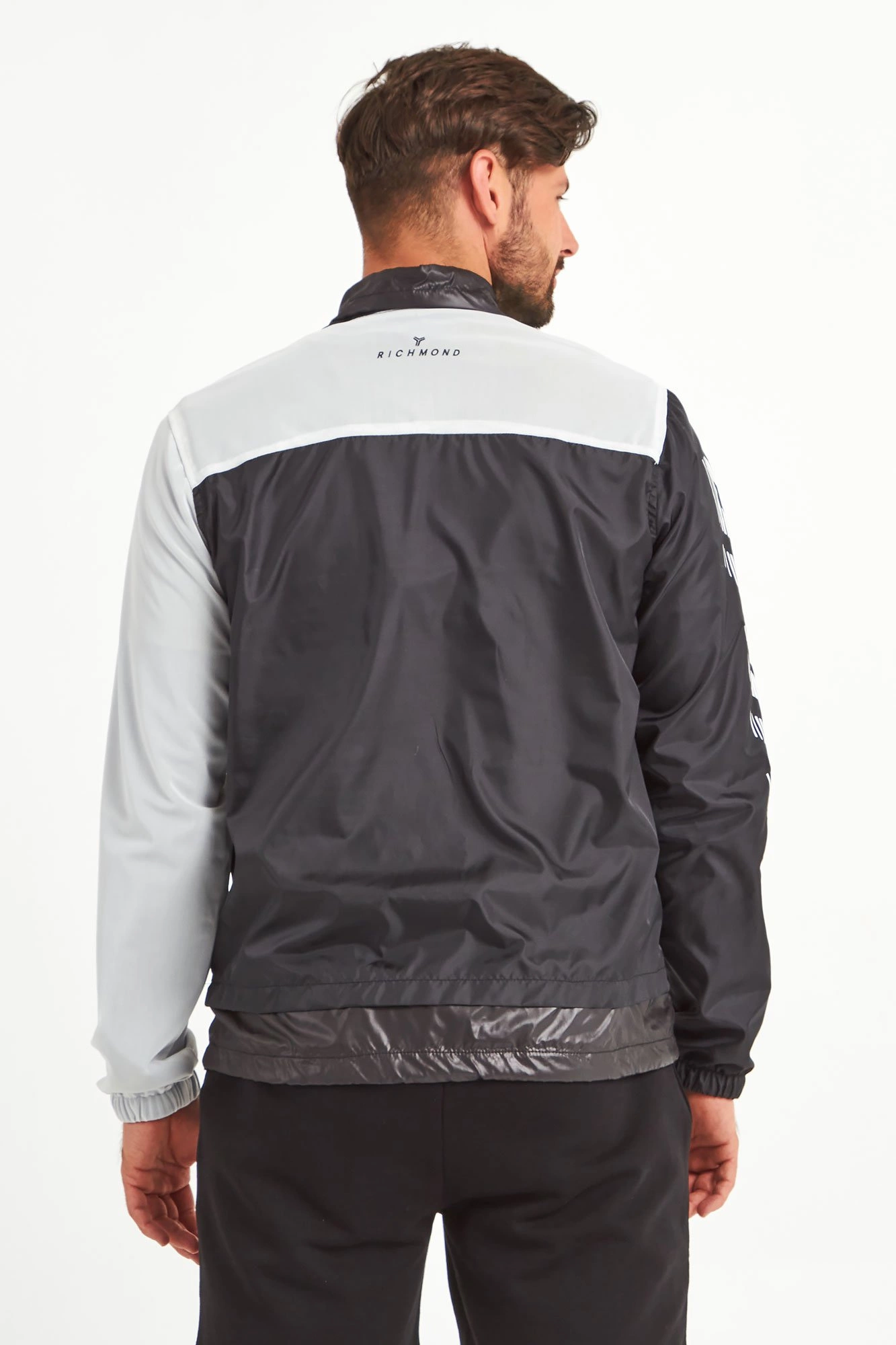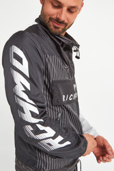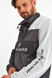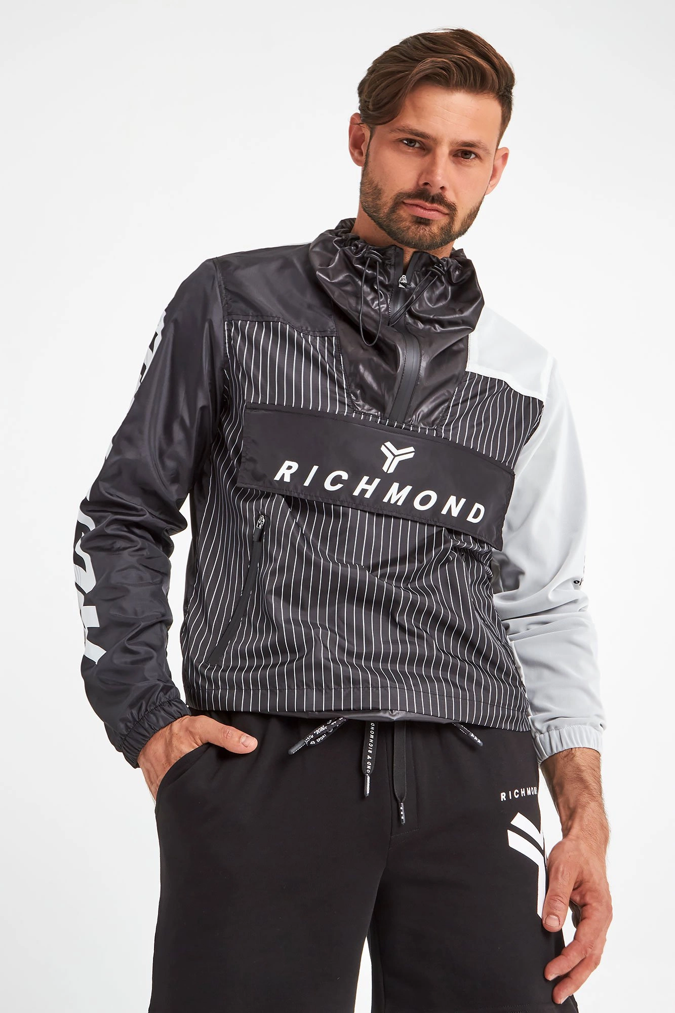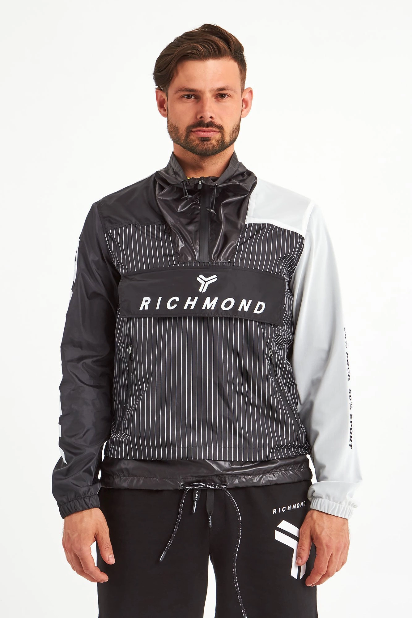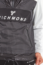 Kurtka marki John Richmond Sport. Czarna z białymi wstawkami z siatki. Wkładana przez głowę. Dekolt ze stójką zapinany za pomocą zamka i regulowany ściągaczami. Z przodu wzór w białe, pionowe paski i zapinana na zamek i napy kangurkowa kieszeń z sygnowaną białym logo patką. Dwie boczne, zapinane kieszenie. Prawy rękaw czarny z białymi napisami, prawy wykonany z białej siatki z czarnymi napisami. Rękawy i dół kurtki wykończone ściągaczami. Dolny ściągacz regulowany za pomocą troczków. Z tyłu, na plecach wstawka z siatki. Na linii karku czarne logo. Niebanalne wykończenie każdej miejskiej, sportowej, casualowej stylizacji.
