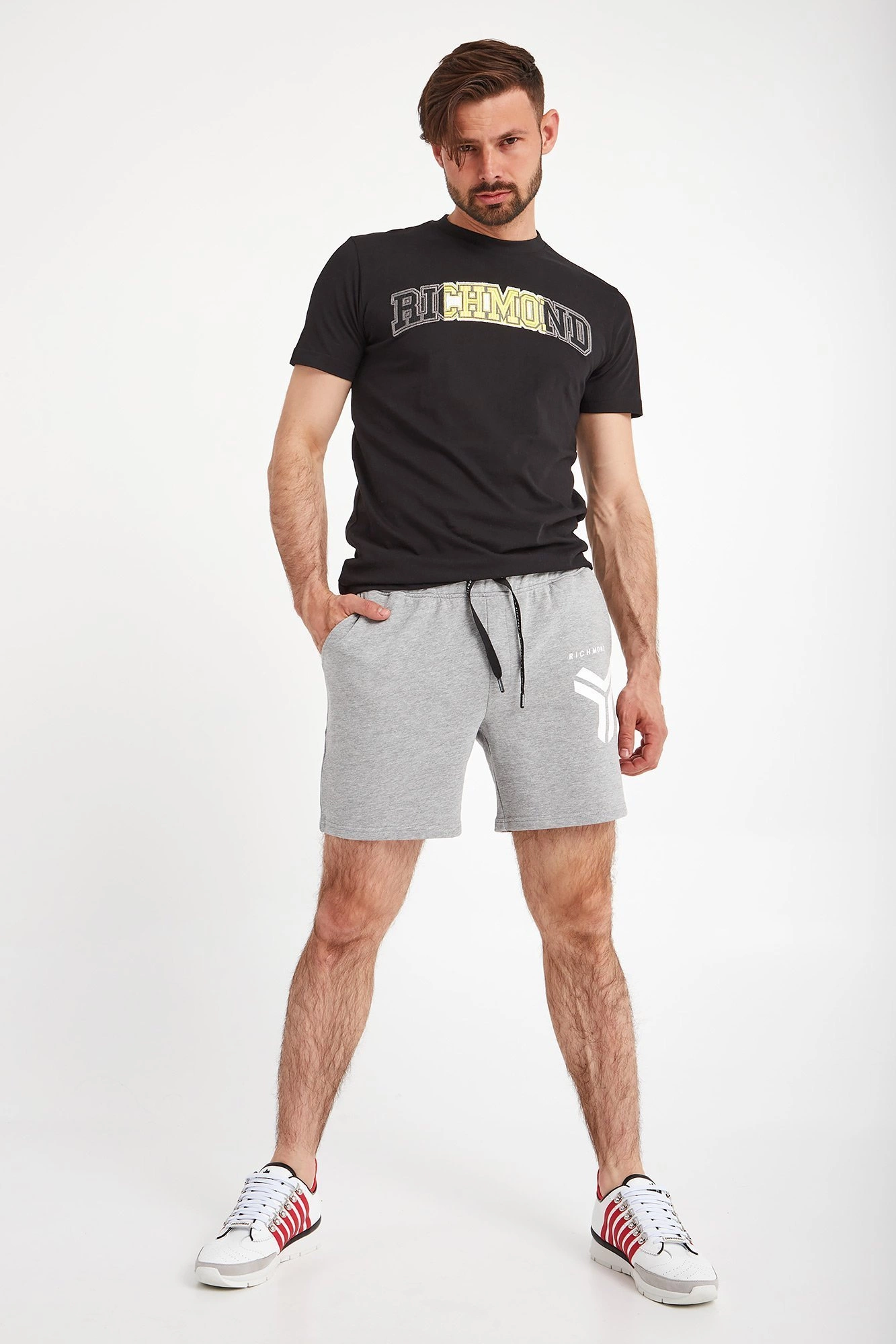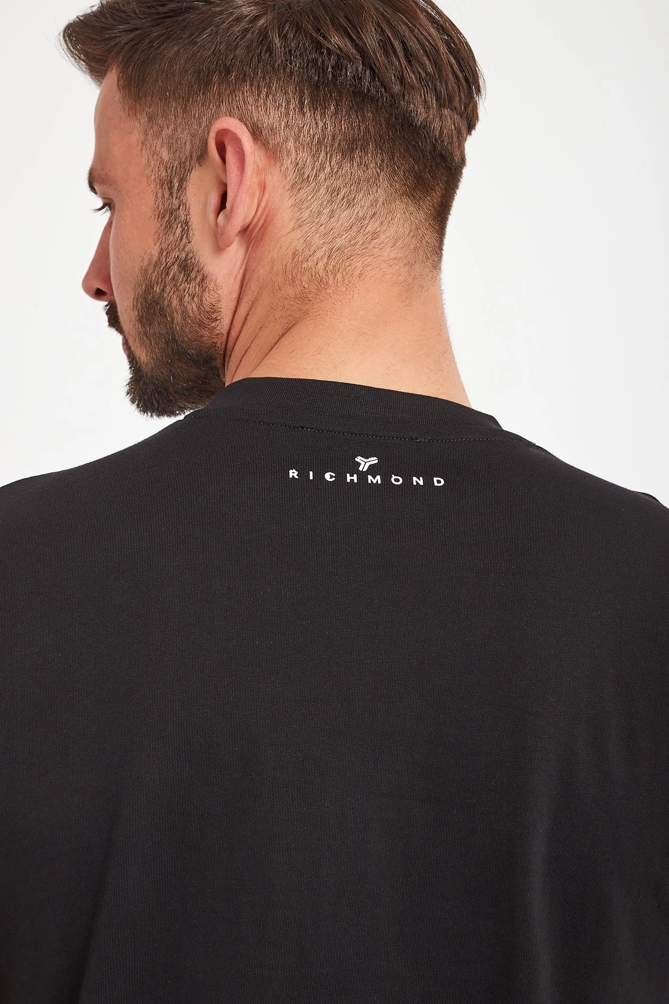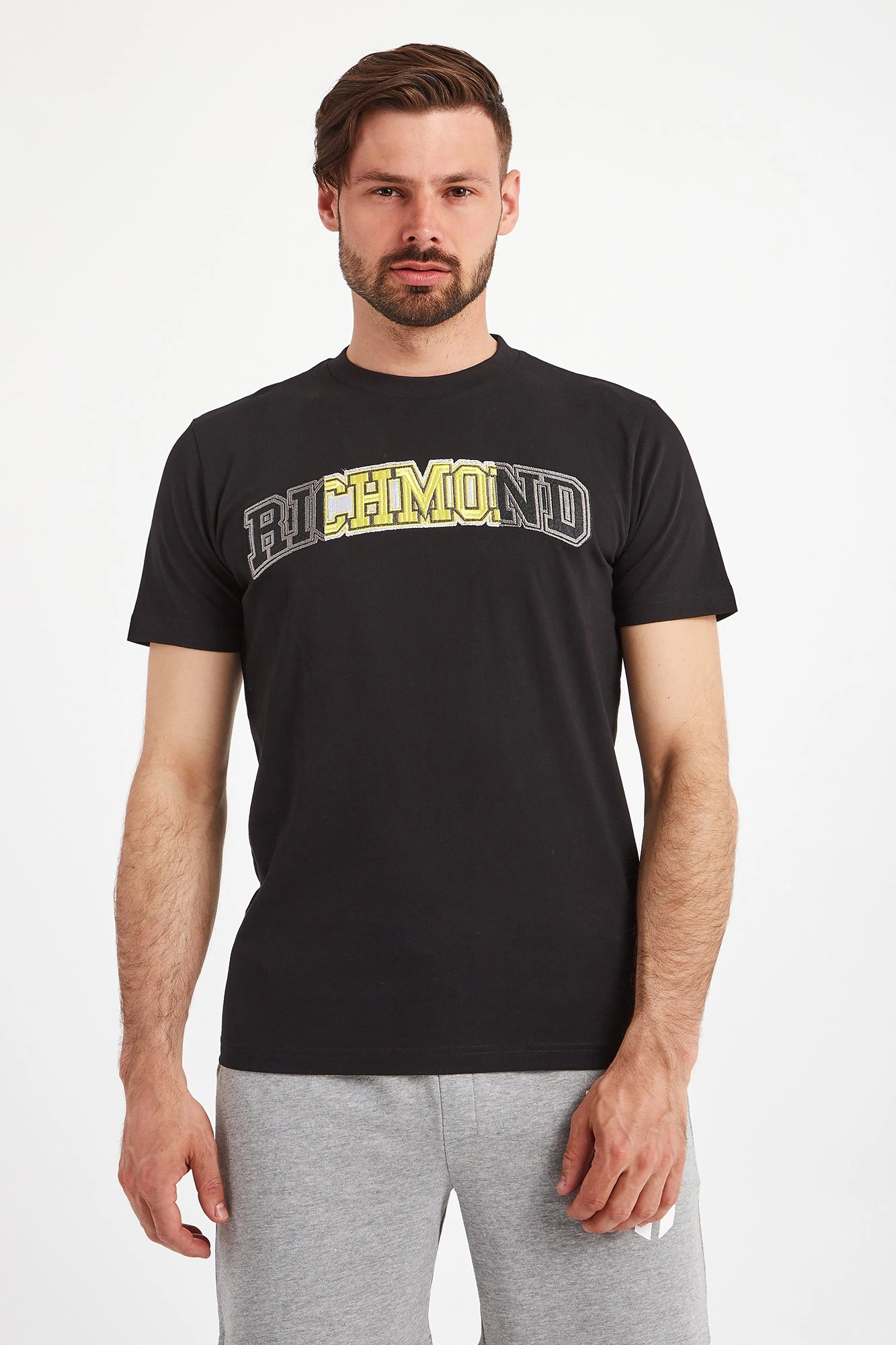 T-shirt marki John Richmond Sport w czarnym kolorze. Fason regular fit, okrągły dekolt w stylu o-neck. Krótki rękaw. Z przodu wszyty, duży, żółto-szary nadruk. Z tyłu przy karku niewielki biały nadruk z nazwą i logiem marki. T-shirt wykonany z najwyższej jakości, przyjemnej w dotyku bawełny. Idealny jako baza do casualowych stylizacji.