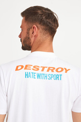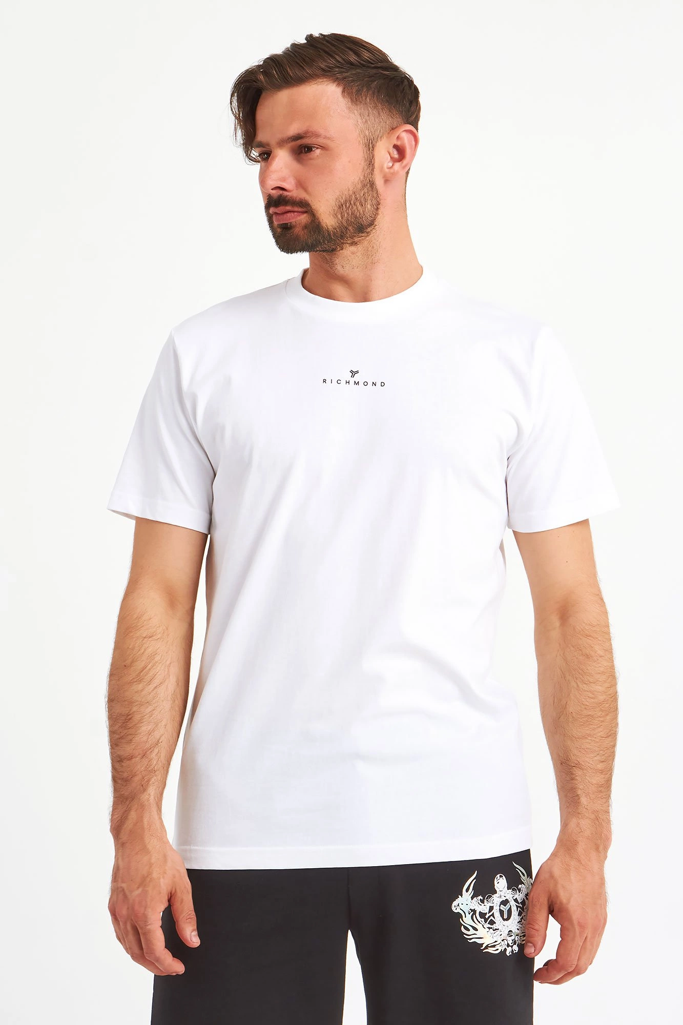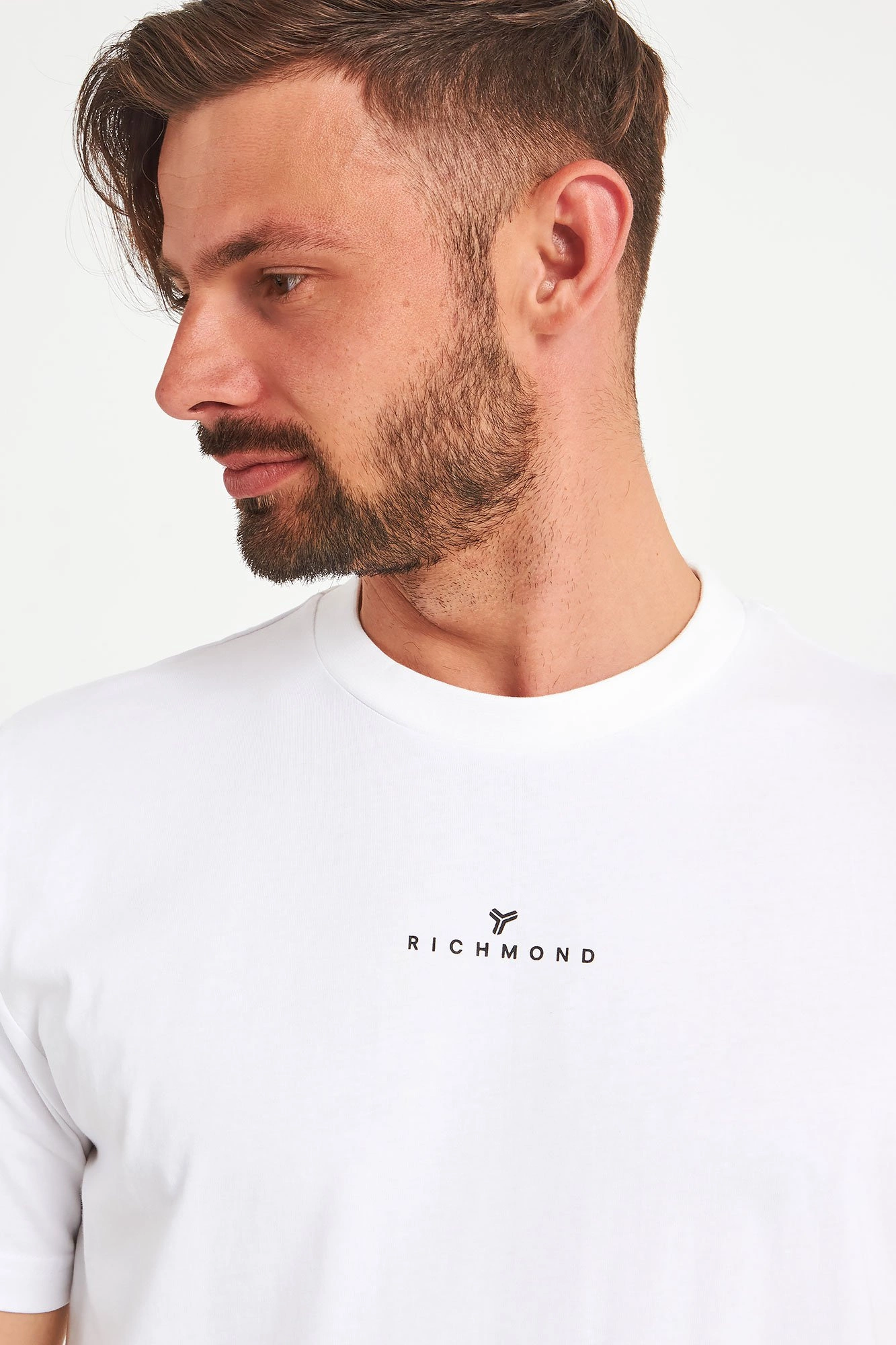 T-shirt marki John Richmond Sport. Biały, z dekoltem typu o-neck zakończonym ściągaczem. Regularny, klasyczny krój. Wykonany z czystej, przyjemnej w dotyku, miękkiej bawełny. Z przodu małe, czarne logo. Z tyłu, na plecach nadruk w postaci pomarańczowo-niebieskiego napisu. Krótkie, proste rękawy oraz dół bluzki wykończone lamówką. Prosta, ponadczasowa propozycja marki John Richmond Sport idealnie sprawdzi się jako baza każdej stylizacji.