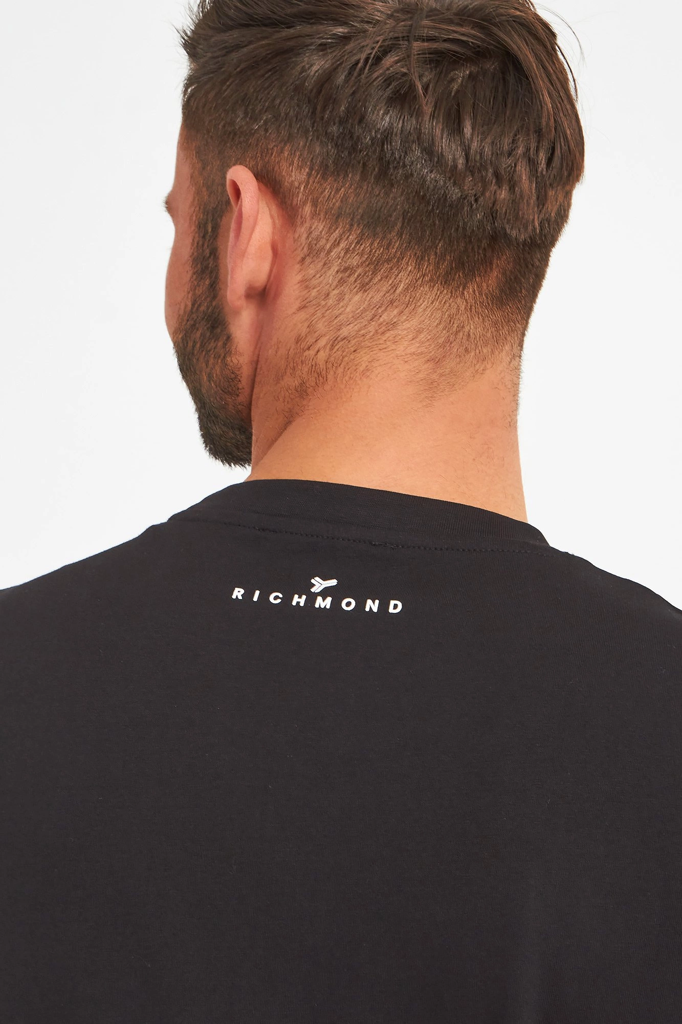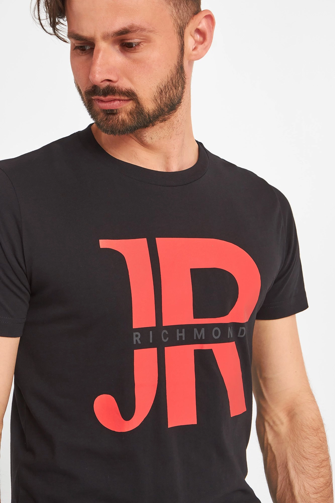 T-shirt w czarnym kolorze marki John Richmond Sport. Regular fit. Okrągły dekolt typu o-neck. Z przodu duży czerwony nadruk w postaci logo marki, z tyłu niewielki biały. T-shirt wykonany z wysokiej jakości, miękkiej w dotyku bawełny. Idealny jako baza casualowych stylizacji.