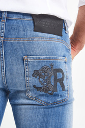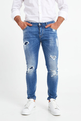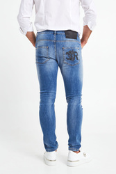 Jeansy marki John Richmond. W klasycznym, niebieskim kolorze, fason skinny fit. Zapinane za pomocą logowanych guzików. W pasie szlufki. Model z pięcioma kieszeniami ozdobionymi sygnowanymi dżetami. Mała kieszeń z przodu z wyszytym, czarnym monogramem marki. Kieszeń z tyłu i pas ozdobiona monogramem marki. Z tyłu na pasie czarna naszywka z tłoczonymi napisami Z przodu i z tyłu jaśniejsze przebarwienia oraz mniejsze i większe przetarcia oraz dziury. Nogawki zwężające się ku dołowi, dopasowane, zakończone lamówką. Spodnie wykończone pomarańczową nitką. Wykonane z przyjemnego w dotyku materiału. Klasyczne i wygodne. Idealnie sprawdzą się w każdym looku, nadając mu stylu i ponadczasowości.