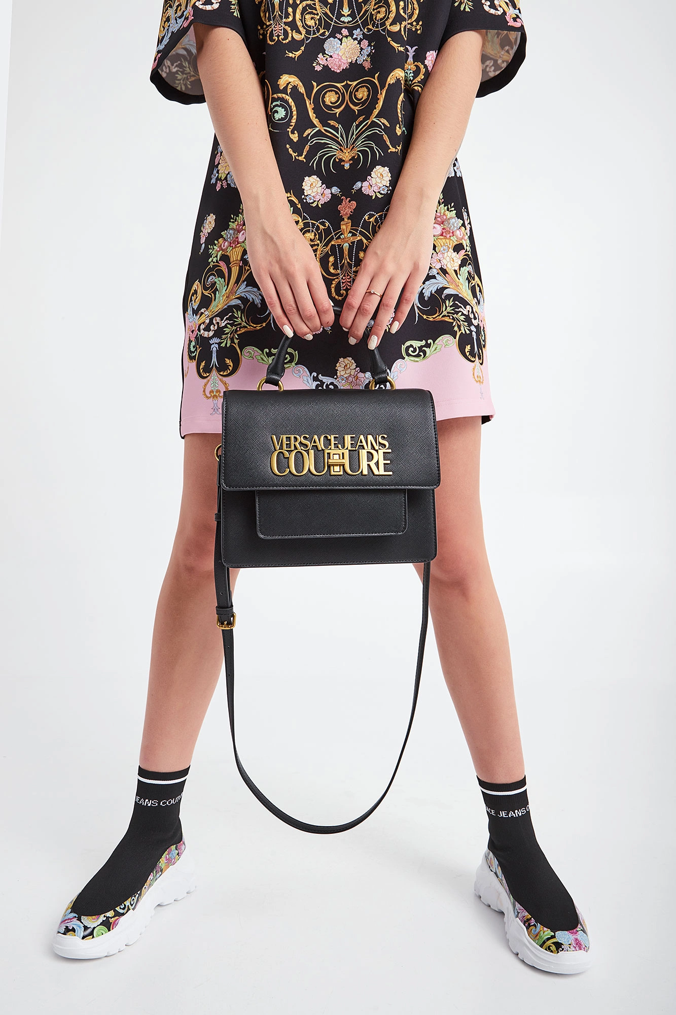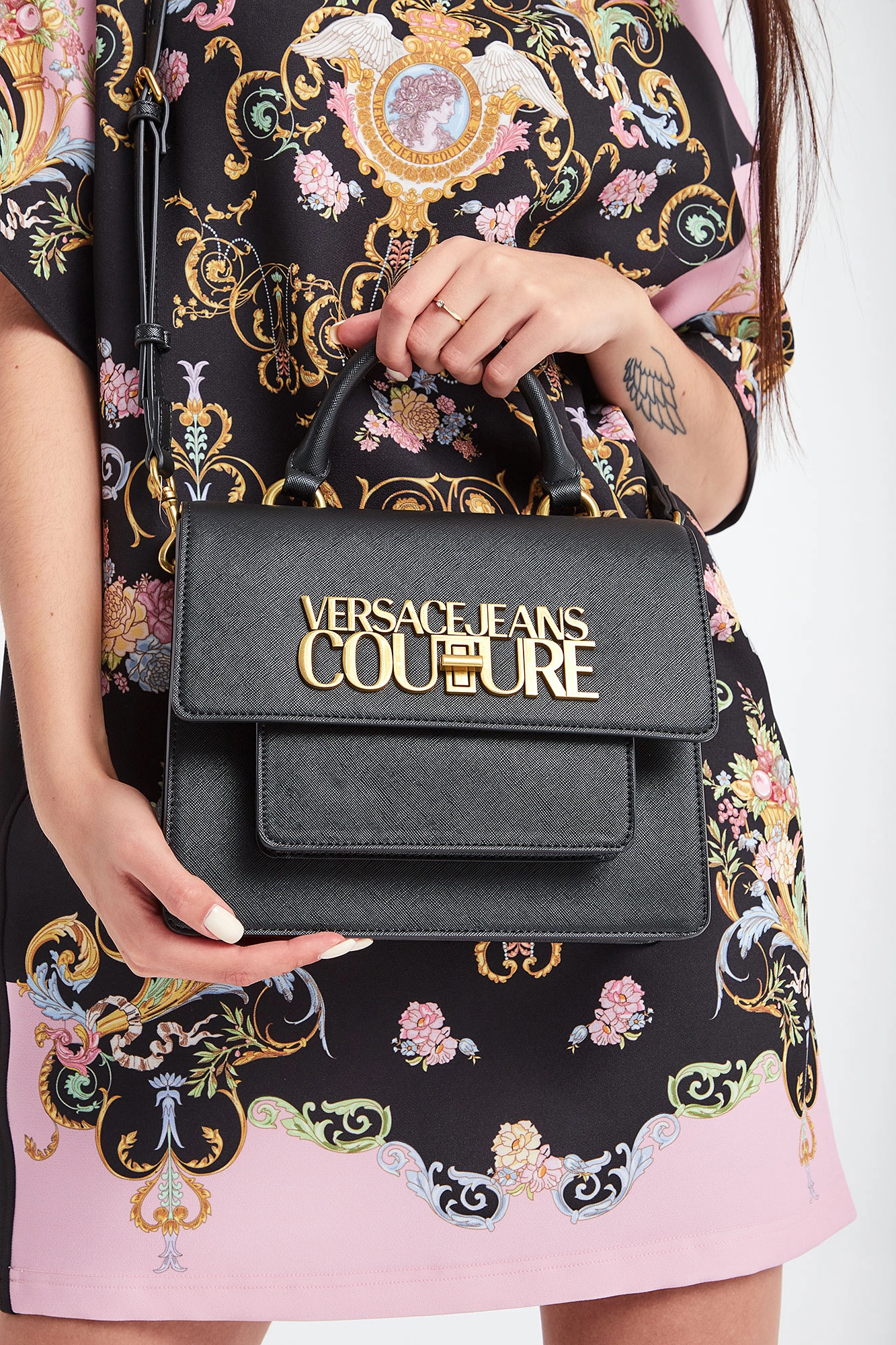 Torebka marki Versace Jeans Couture. Czarna, ze złotymi elementami, jednokomorowa. Zapinana za pomocą przekręcanego zapięcia. Na klapie duże, metalowe logo w charakterystycznym dla marki złotym kolorze. Na wewnętrznej stronie klapy metalowa, sygnowana, złota płytka. W środku jedna niezapinana i jedna zapinana na zamek kieszeń. Do noszenia w ręku na jednej rączce lub na regulowanym pasku. Czarna, logowana podszewka. W zestawie worek przeciwkurzowy. Ponadczasowa propozycja marki Versace Jeans Couture sprawdzi się w każdej stylizacji, nadając jej stylu, klasy oraz elegancji.