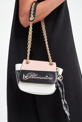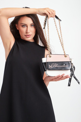 Torebka marki Be Blumarine. Biało-czarna z różowo-czarną klapą. Jednokomorowa. Z przodu haftowane logo w pudrowym, różowym kolorze ozdobione połyskującym kryształkiem. Zamykana za pomocą magnetycznego klipsa. Do noszenia na łańcuszku z możliwością przewleczenia go przez oczka w klapie i stworzenia dwóch rączek. Z boku przywieszona zawieszka z monogramem marki oraz ozdobna tasiemka. Czarna, logowana podszewka. Stylowa i ponadczasowa.