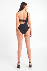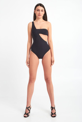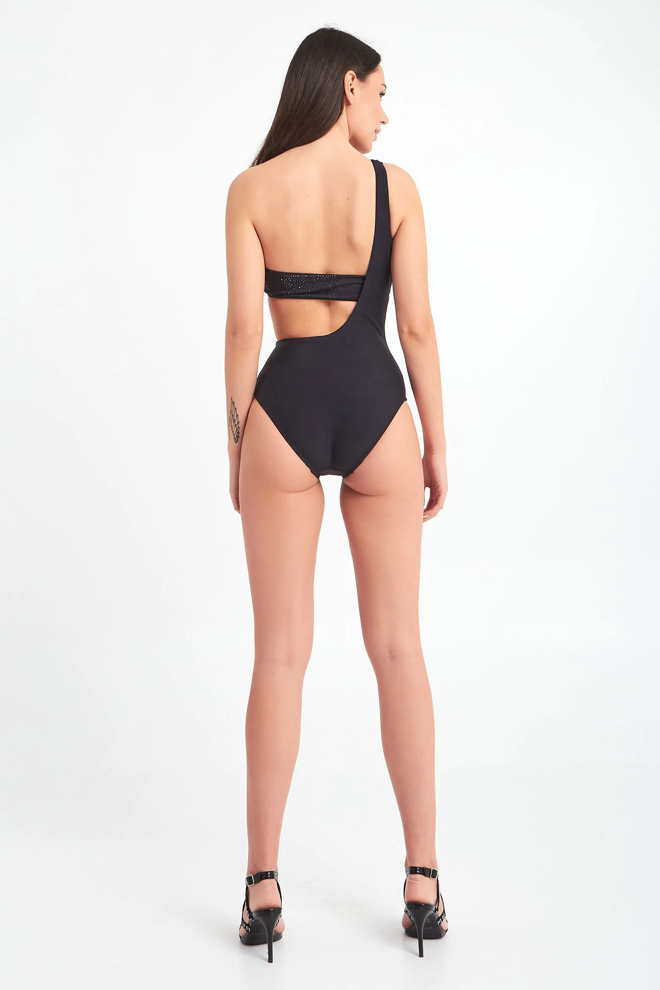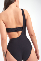 Strój kąpielowy marki Roidal. Czarny, jednoczęściowy, o asymetrycznym, nietuzinkowym kroju. Po lewej stronie stroju wszyty stanik bez ramiączka, pokryty mieniącymi się, biżuteryjnymi kryształkami Swarovskiego, tworzący zmysłowe wcięcie na brzuchu i plecach. Reszta stroju gładka. Wykonany z miękkiego, przyjemnego w dotyku, elastycznego materiału z lycrą. Kobiecy, stylowy strój kąpielowy w klasycznym kolorze i o niebanalnym kroju.