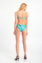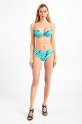 Strój kąpielowy marki Roidal. Dwuczęściowy, w niebiesko-zielono-czarny print. Góra z nieodpinanymi, regulowanymi ramiączkami w kolorze stroju. Zapewnia doskonałe utrzymanie biustu oraz podkreśla walory kobiecego dekoltu. Lekko usztywniane miseczki na fiszbinach. Marszczenia na biuście. Zapinana z tyłu na złoty klips. Dół gładki. Kobiecy, kolorowy i zmysłowy strój kąpielowy.