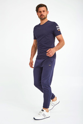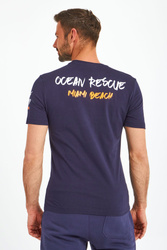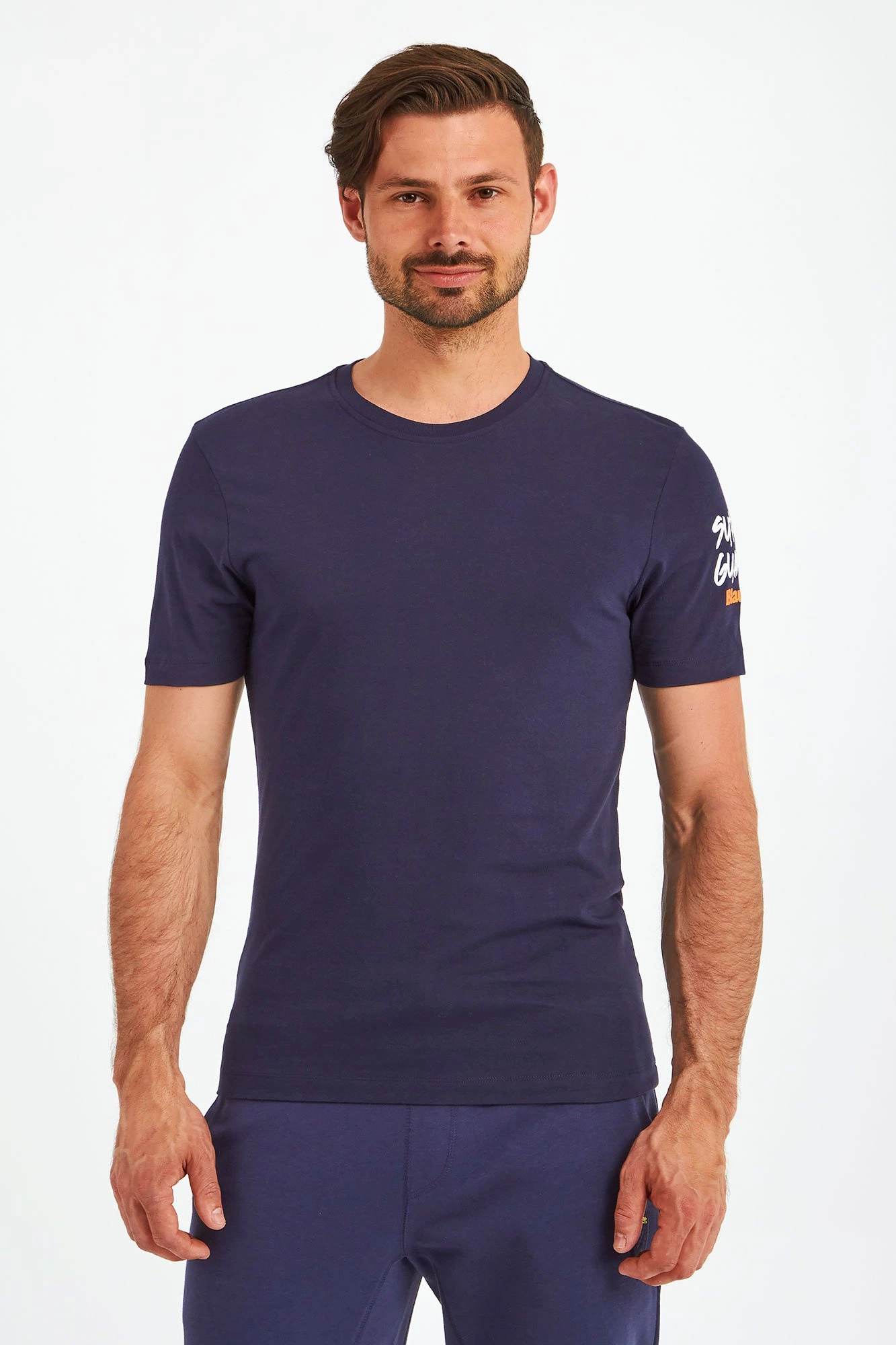 T-shirt marki Blauer w granatowym kolorze. Klasyczny fason, krótki rękaw, dekolt typu o-neck. Biało-pomarańczowy nadruk na plecach i lewym ramieniu. Wykonana z wysokiej jakości, miękkiej bawełny. Idealny jako baza letnich stylizacji.