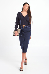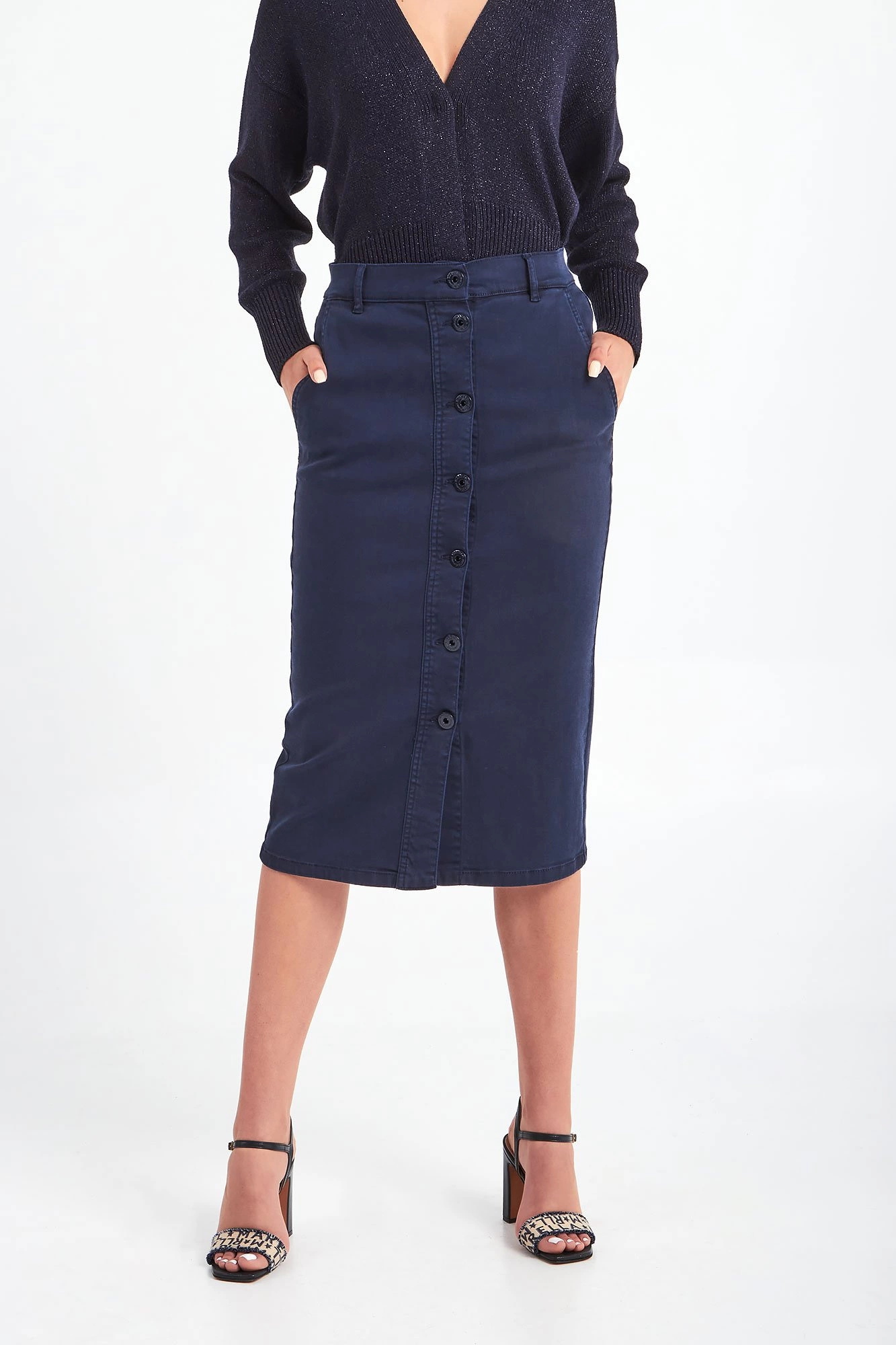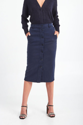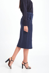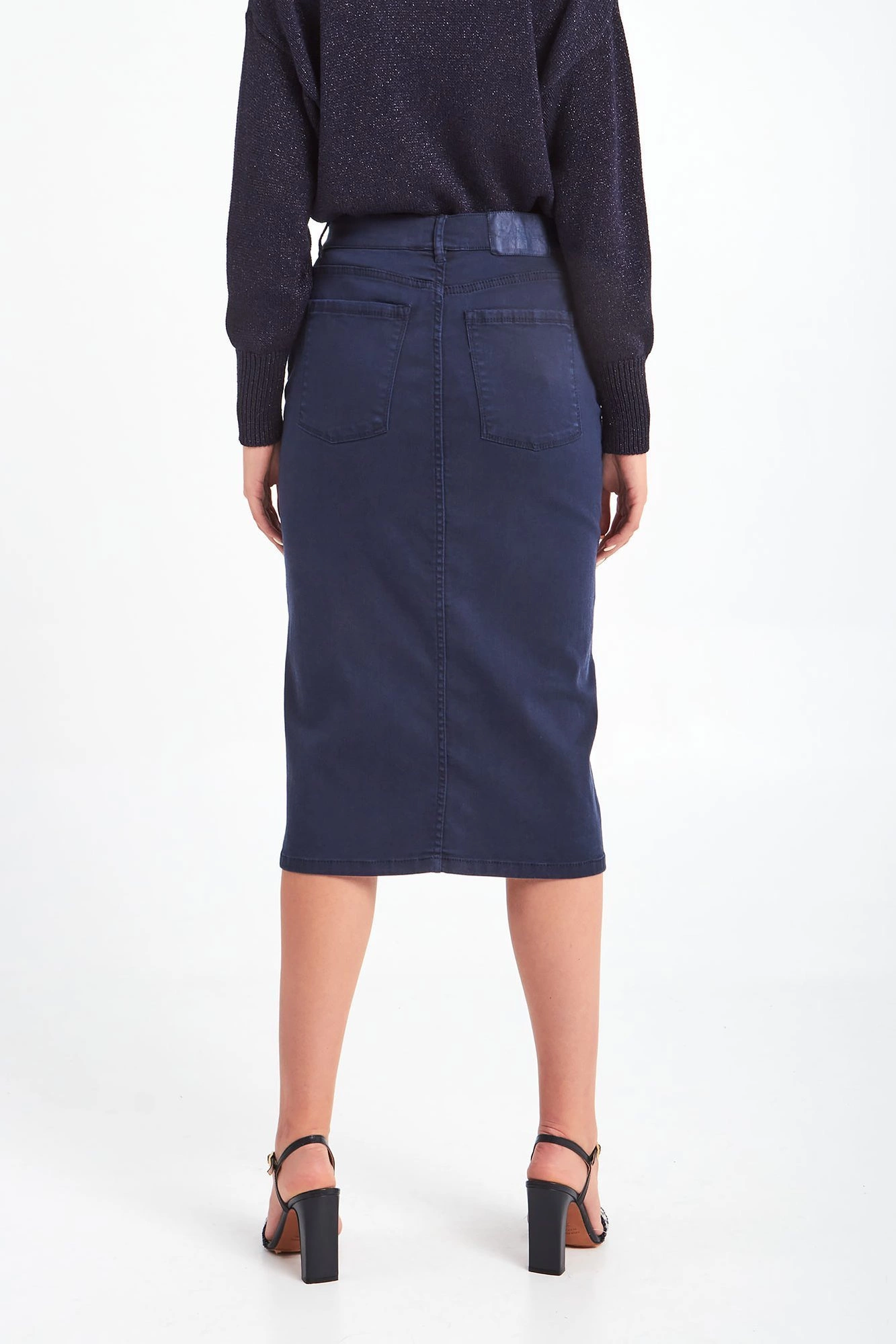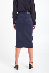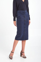 Ołówkowa spódnica marki Marella. Granatowa, długość midi, wysoki stan. Spódnica jest częścią projektu Marella Monochrome - jednokolorowe style ze starannie dobranych materiałów. Zapinana z przodu na duże, sygnowane guziki w kolorze materiału. Z przodu i z tyłu po dwie niezapinanie kieszenie. W pasie szlufki. Z tyłu błękitna, skórzana aplikacja z tłoczoną nazwą marki. Wykonana z miękkiej, przyjemnej w dotyku, elastycznej tkaniny. Klasyczny, ponadczasowy fason będzie doskonałym uzupełnieniem każdej stylizacji.