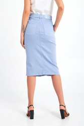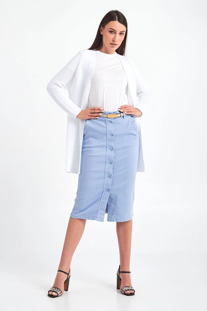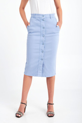 Ołówkowa spódnica marki Marella. Błękitna, długość midi, wysoki stan. Spódnica jest częścią projektu Marella Monochrome - jednokolorowe style ze starannie dobranych materiałów. Zapinana z przodu na duże, sygnowane guziki w kolorze materiału. Z przodu i z tyłu po dwie niezapinanie kieszenie. W pasie szlufki. Z tyłu błękitna, skórzana aplikacja z tłoczoną nazwą marki. Wykonana z miękkiej, przyjemnej w dotyku, elastycznej tkaniny. Klasyczny, ponadczasowy fason będzie doskonałym uzupełnieniem każdej stylizacji.